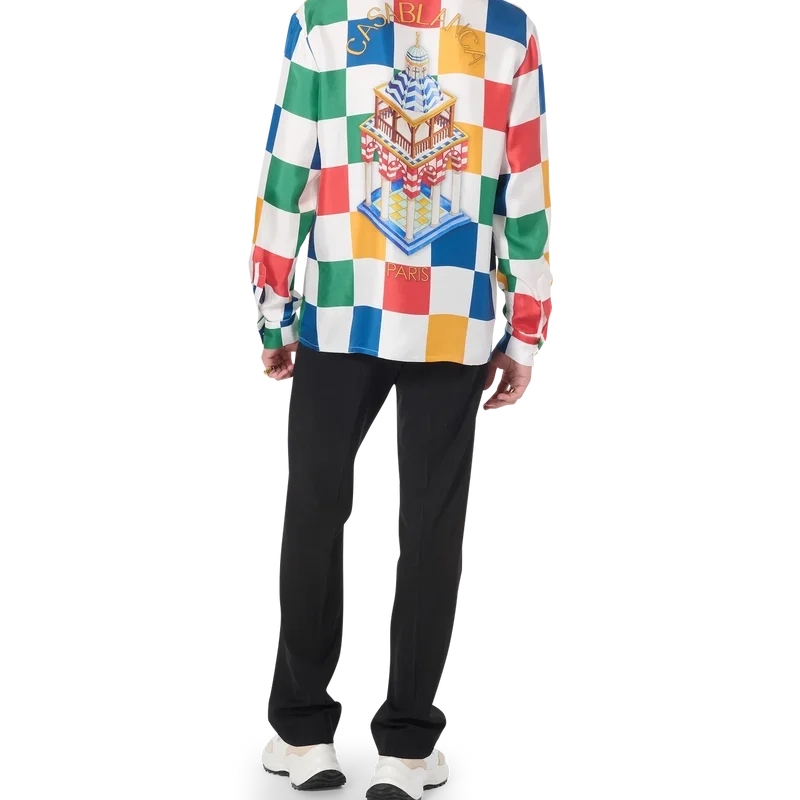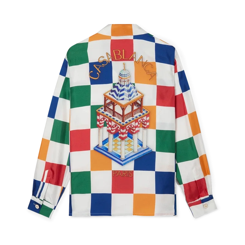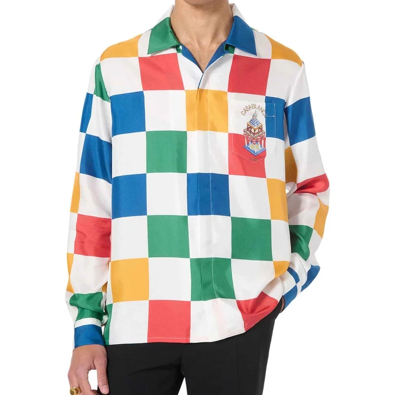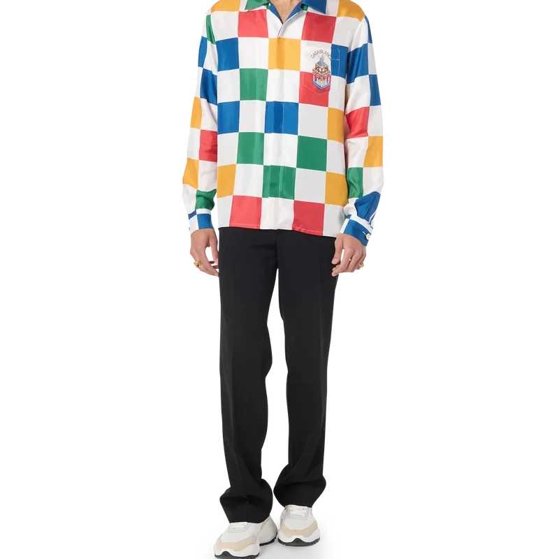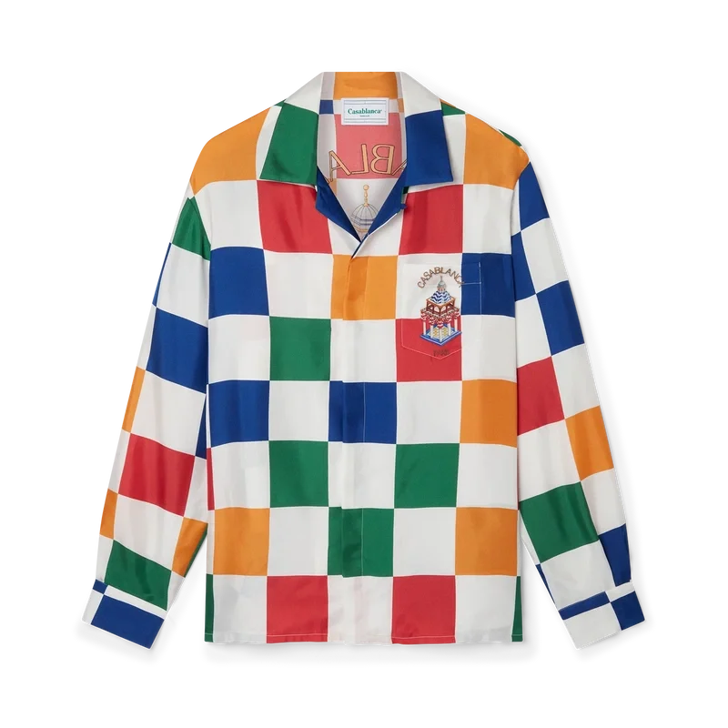 La camicia in seta a quadri Casablanca Primary è un modello a maniche lunghe stampato caratterizzato da un motivo a scacchiera su tutta la superficie, un omaggio ai giochi da tavolo arabi. Completata da una grafica stagionale sul retro e sul taschino. Rifinita con un colletto pensato per essere indossato aperto e una chiusura frontale con bottoni.