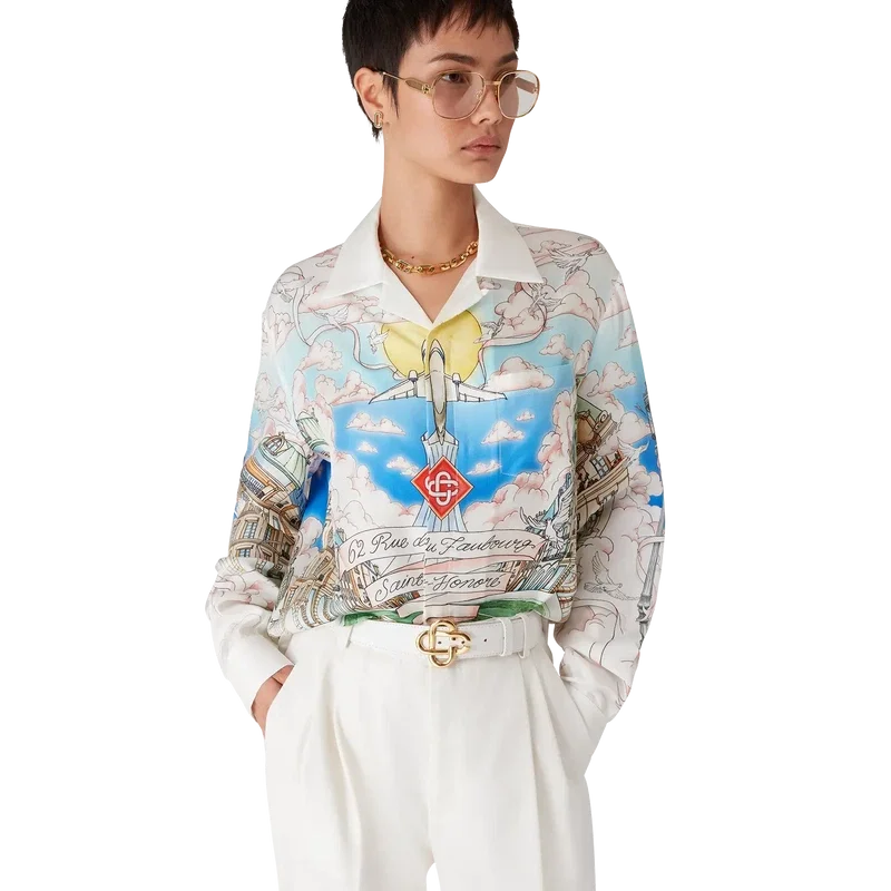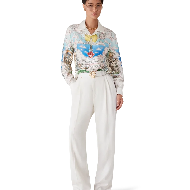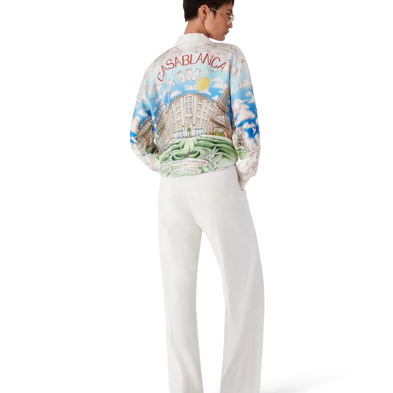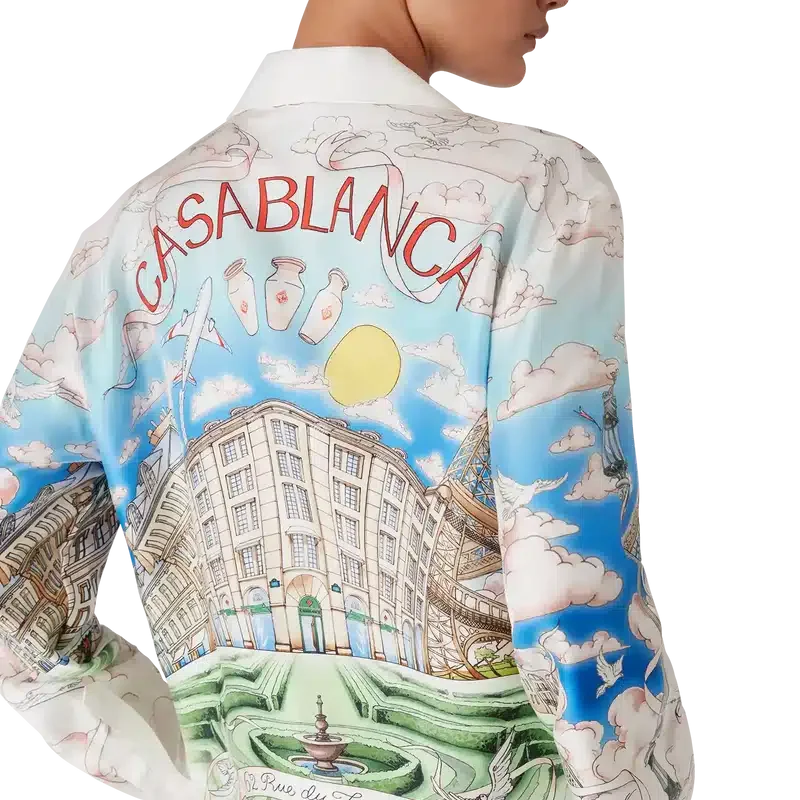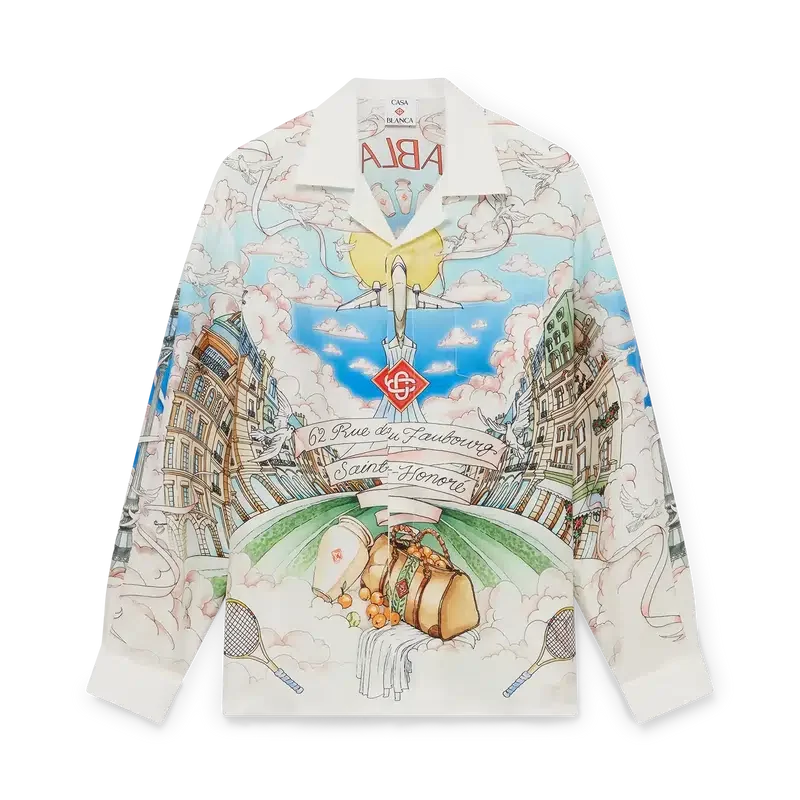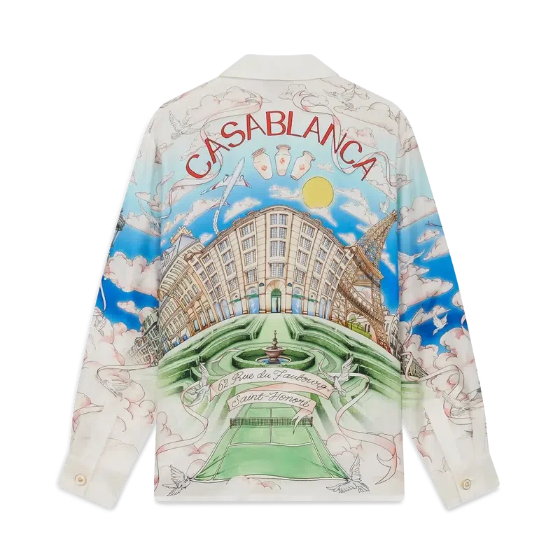La camicia in seta a maniche lunghe La Vie Parisienne è un modello con stampa all-over, progettato in esclusiva per il nostro negozio monomarca, caratterizzato da motivi ispirati all’architettura, al tennis, alla natura e ai viaggi, che raffigurano il nostro negozio di Parigi, situato in Rue Du Faubourg Saint-Honoré, una delle strade più storiche al mondo per la moda e il design ed emblema dell’eleganza e della raffinatezza francesi. Completata da colletto cubano, chiusura con bottoni, bottoni in corozo con logo Cc intrecciato e bottoni smaltati con bordo dorato ai polsini. Questo capo è disponibile in esclusiva su Casablancaparis.Com e nel nostro negozio di Parigi.