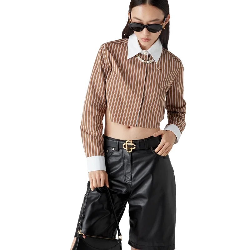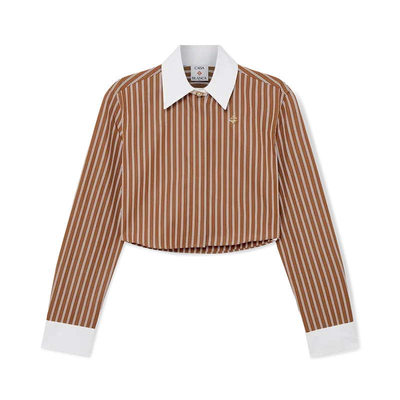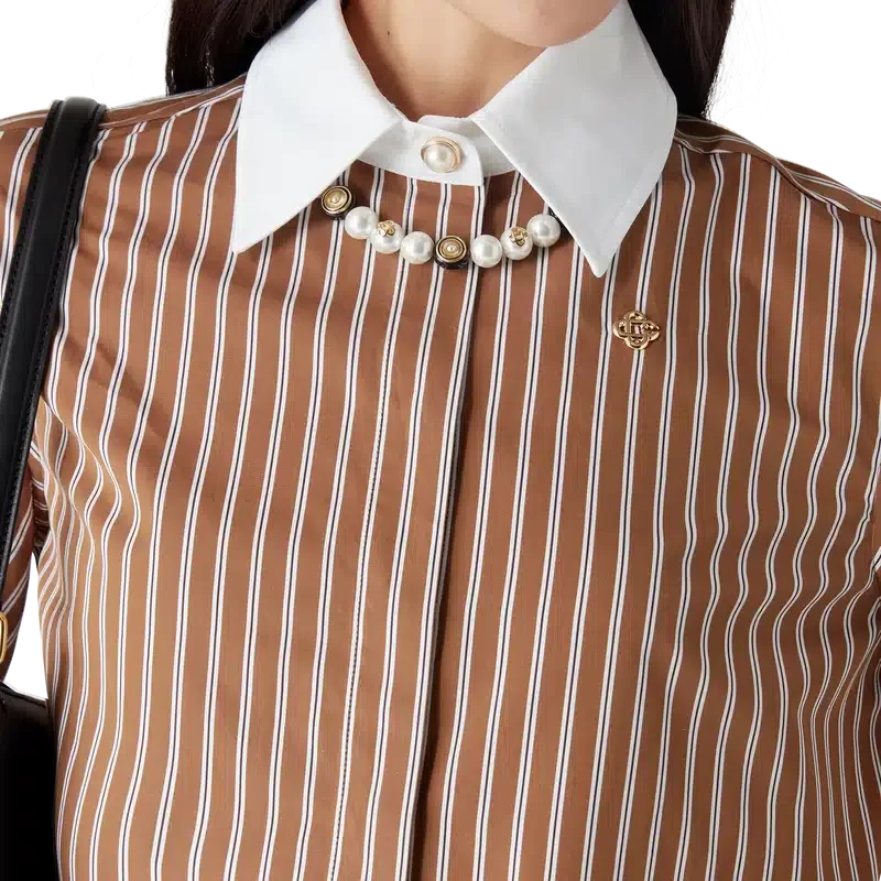 La camicia a maniche lunghe corta a righe è un modello di pantaloncini realizzato in tessuto di cotone Barra. Rifinita con chiusura a bottoni, bottoni in corozo con logo CC intrecciato, bottone in madreperla con bordo dorato sul colletto, colletto a punta e polsini bianchi a contrasto e orlo arrotondato.