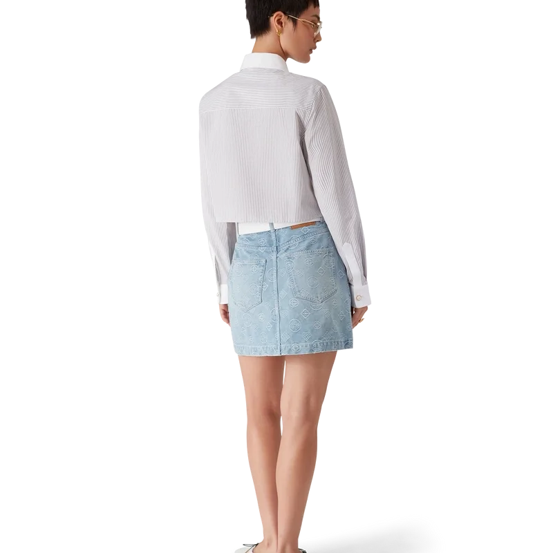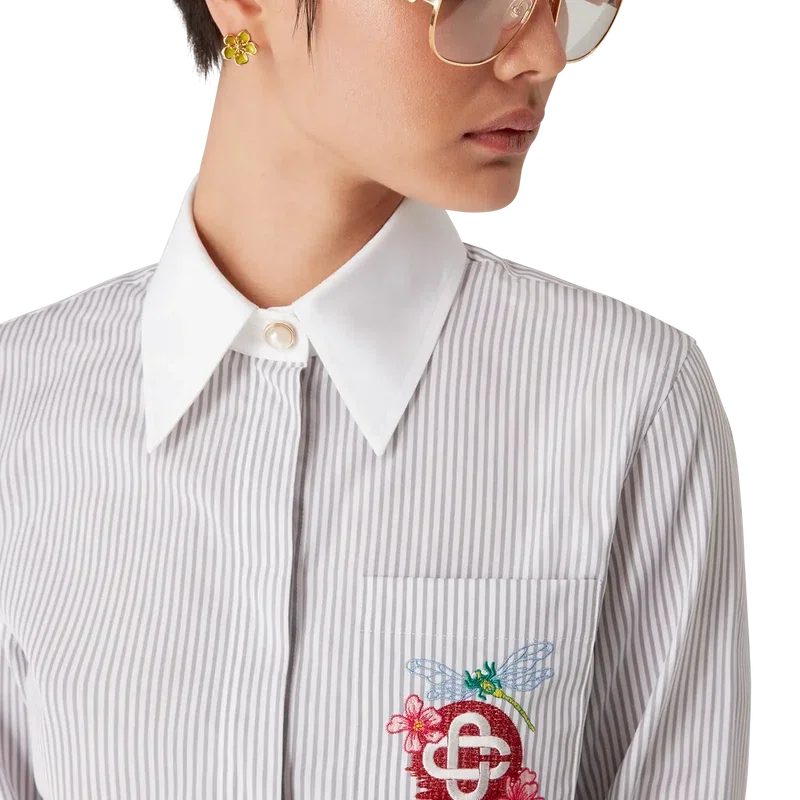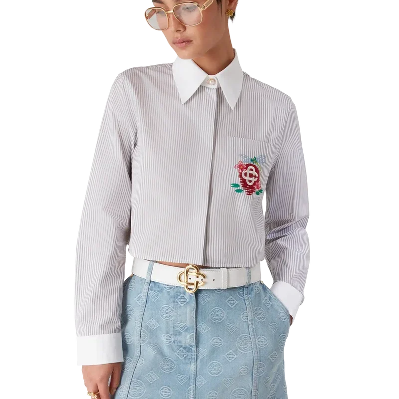 La camicia corta a righe con maniche lunghe è un modello corto realizzato in tessuto di cotone Barra. Rifinita con chiusura a bottoni, bottoni in corozo con logo CC intrecciato, bottoni in madreperla con bordo dorato sul colletto e sui polsini, taschino sul petto con la grafica floreale a libellula della stagione e colletto a punta e polsini bianchi a contrasto.
