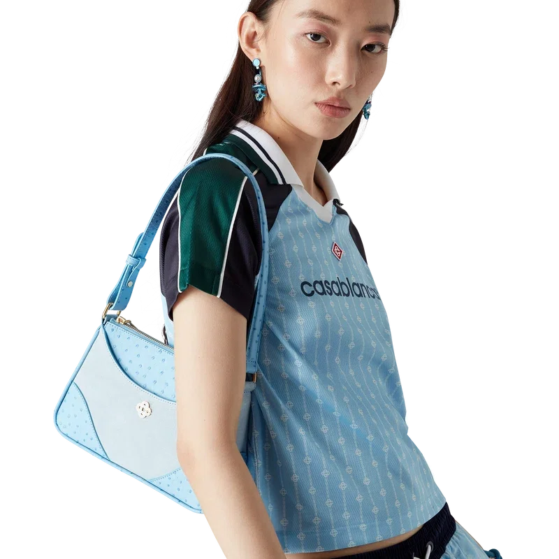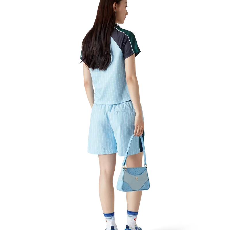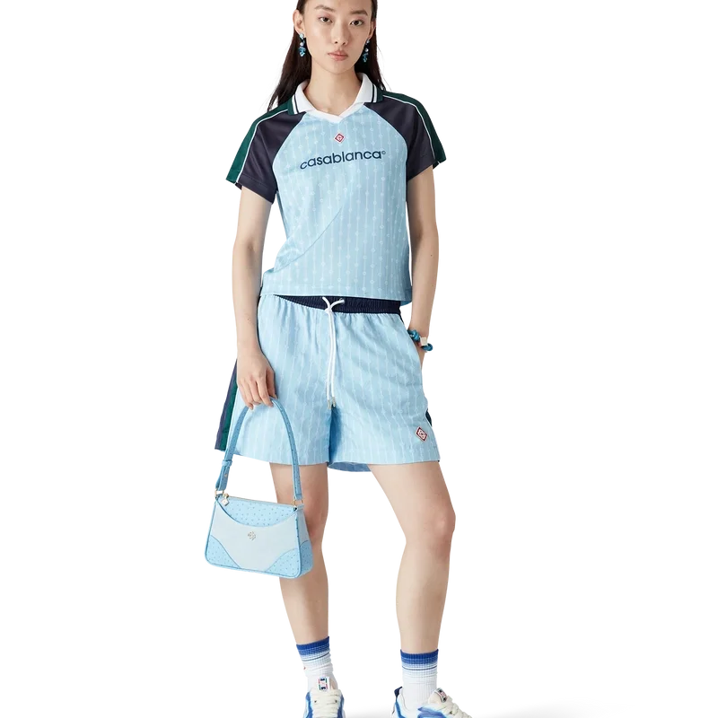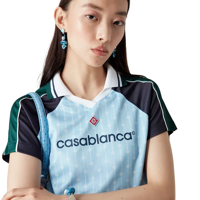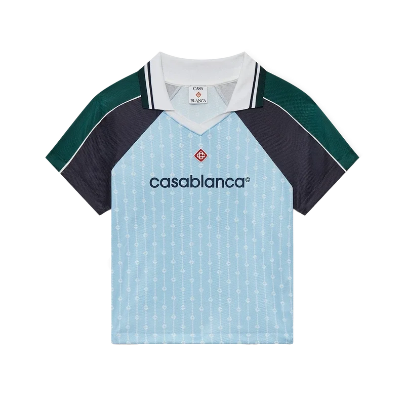 La maglia da calcio Pinstripe Laurel è un capo sportivo a maniche corte realizzato in tessuto a rete Birdseye e caratterizzato dal logo Cc intrecciato, simbolo del marchio. Il modello è impreziosito da inserti neri e verdi sulle spalle e sulle maniche, dal logo a rombo caratteristico, dal logo Casablanca, da bordature bianche, da uno scollo a V a costine e da un colletto con bordi a righe nere, bianche e verdi.