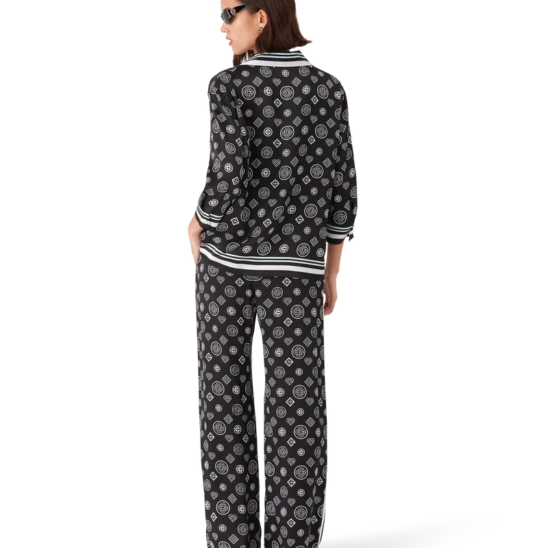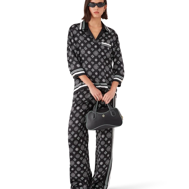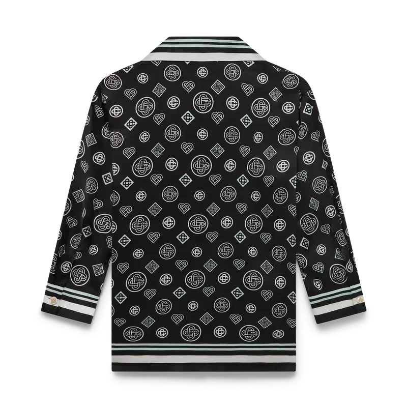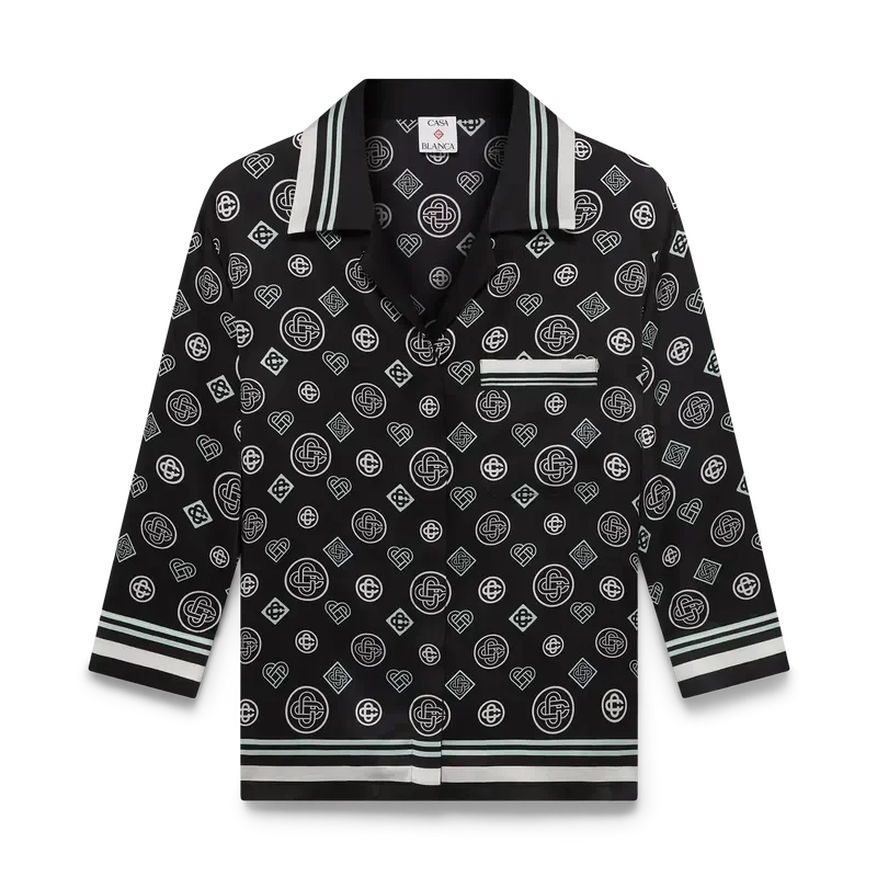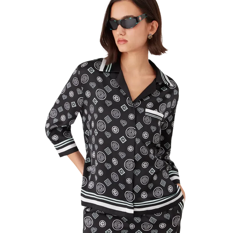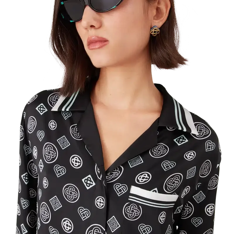 La camicia pigiama in raso di seta Monogram presenta una stampa all-over con il logo Honeydew della stagione. Questo motivo si differenzia dagli altri Monogram, poiché combina forme uniche per formare un disegno coerente. Si tratta più che altro di un design basato su icone. Completata da maniche di media lunghezza, taschino sul petto, colletto cubano, chiusura con bottoni, bottoni con il caratteristico logo CC intrecciato e dettagli a righe bianche e nere su colletto, polsini, orlo e taschino.