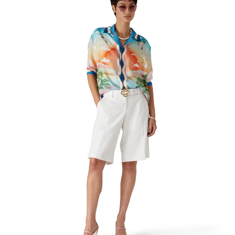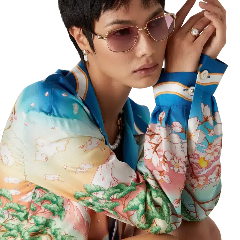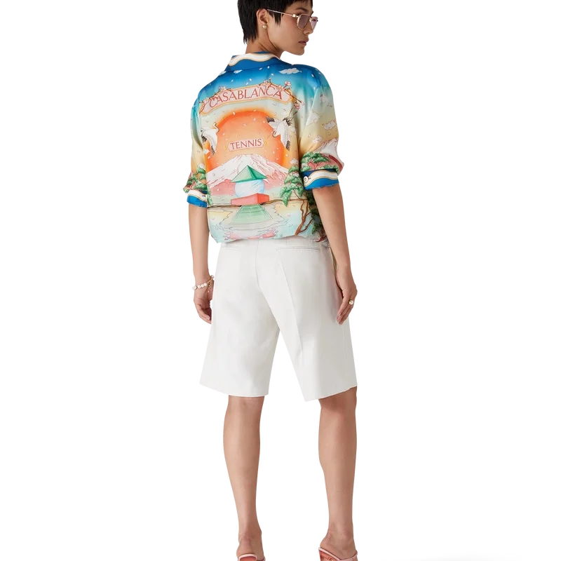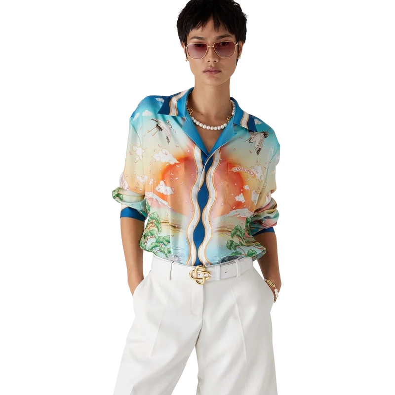 La camicia in seta Tennis Club è un modello a maniche lunghe con stampa all-over che presenta la versione di questa stagione del Tennis Club utilizzando il nostro layout classico ma con l’arte tradizionale giapponese, rendendola un capo dalla forte narrazione e un modo splendido per fondere stili artistici, realizzata in tessuto di twill di seta. Completata da chiusura con bottoni, bottoni in corozo con logo CC intrecciato, bottoni in madreperla con bordo dorato caratteristici sul colletto e sui polsini, e dettagli a strisce ispirati al design Memphis Wave sull’orlo, sui polsini, sull’abbottonatura e sul colletto.