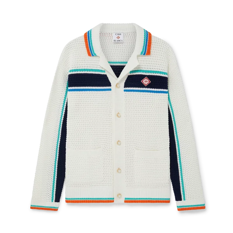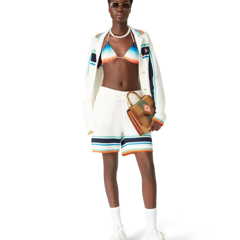 La Tennis Crochet Shacket è un modello a maniche lunghe dalla trama particolare, realizzato in tessuto di cotone biologico lavorato all’uncinetto e caratterizzato dal logo a rombi iconico della Maison, che richiama il tema del viaggio e delle vacanze della capsule collection. Completata da collo, polsini, orlo e abbottonatura a costine, tasche applicate sul davanti, bottoni in madreperla con bordo dorato, chiusura frontale con bottoni e dettagli a righe acquamarina, blu e bianche sul petto, sul retro e lungo le maniche, con bordi a contrasto su polsini, orlo e collo.