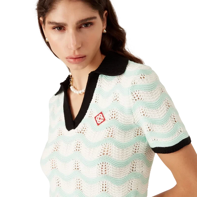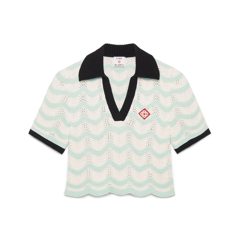 La polo corta in cotone all’uncinetto con motivo a onde è un modello a maniche corte che presenta il logo a rombi iconico della Maison, realizzato in tessuto di cotone all’uncinetto. Rifinita con scollo a V, colletto, orlo ispirato alle onde e abbottonatura, polsini e colletto a costine neri a contrasto – Progettata per arrivare sopra l’ombelico.