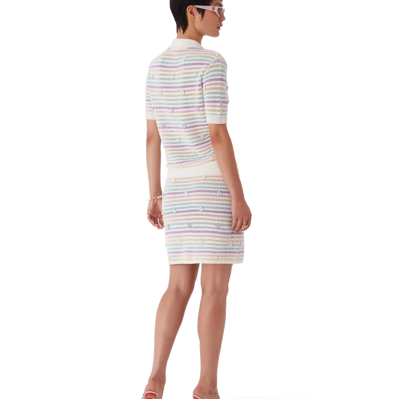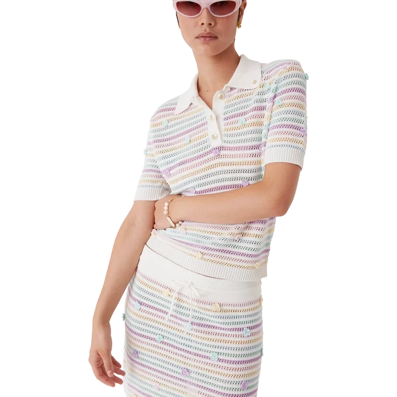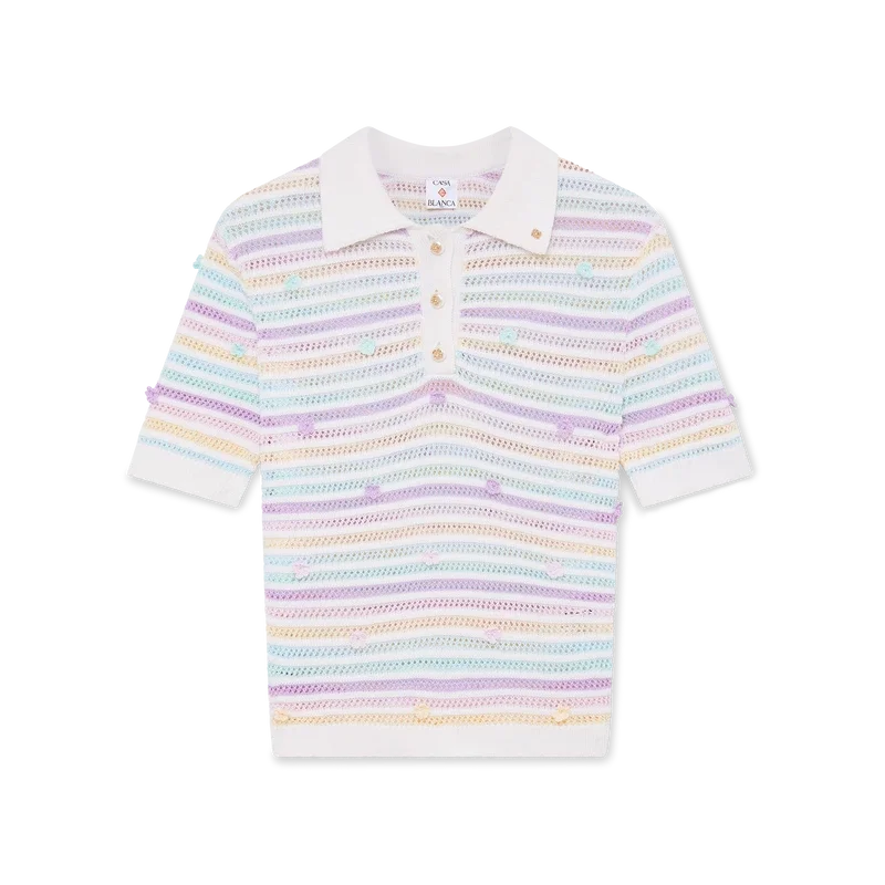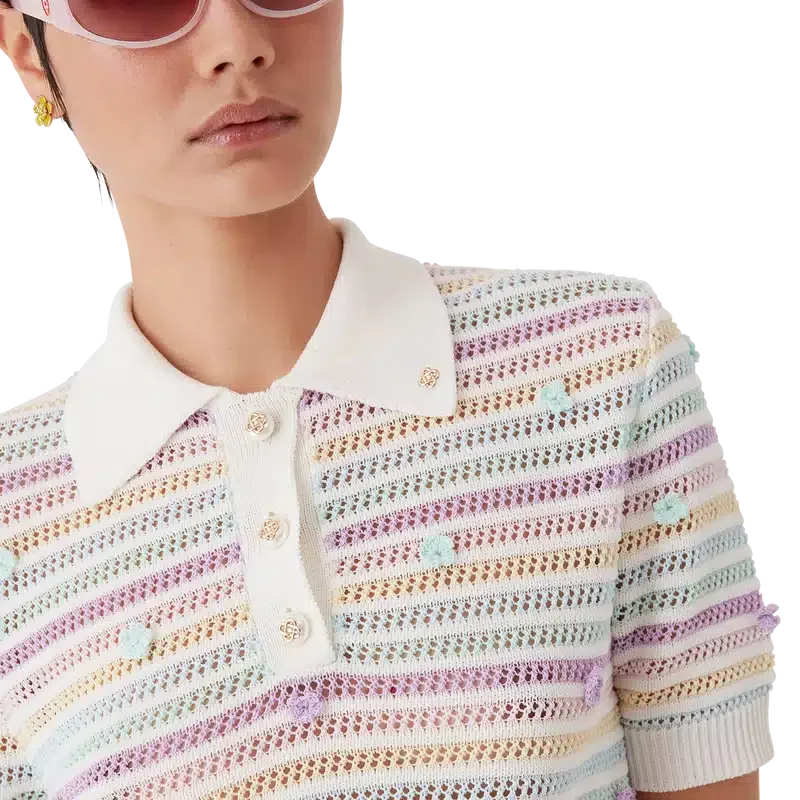 La polo in cotone all’uncinetto a righe floreali è un classico modello a maniche corte realizzato in tessuto di cotone a trama larga. Rifinita con bottoni in madreperla con bordo dorato, motivi floreali, collo, polsini, abbottonatura e orlo a costine.