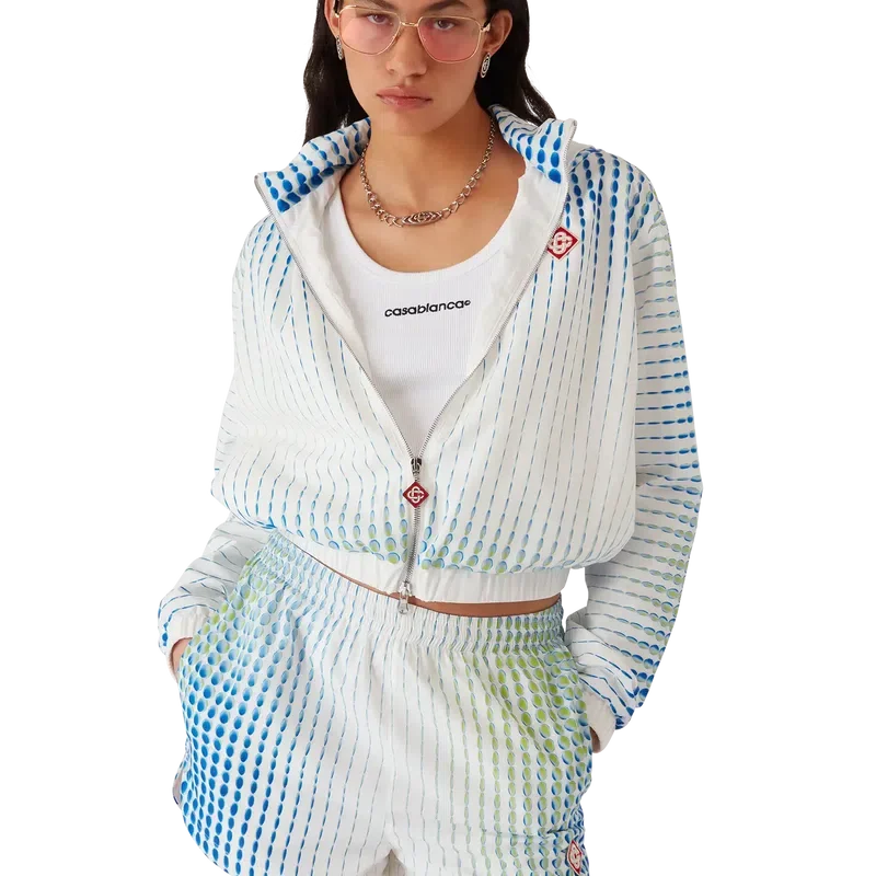 La giacca a vento Dots è un capo sportivo realizzato in taffetà tecnico con la maestria artistica tipica della Maison, caratterizzata da motivi sfumati ed effetti materici. Completa la giacca con maniche lunghe, cappuccio con chiusura a coulisse, polsini e orlo elasticizzati, chiusura con cerniera dotata della linguetta a forma di diamante tipica della Maison e logo a forma di diamante della Maison.
