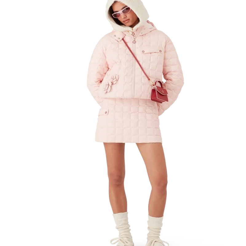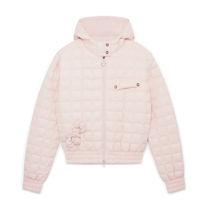 La giacca con cappuccio trapuntata in nylon è un modello a maniche lunghe caratterizzato da un motivo trapuntato a quadrati. Completa di cappuccio, chiusura con zip, tasca con patta dotata dei bottoni a pressione piatti smaltati e placcati in oro con il logo CC intrecciato della Maison, e polsini e orlo elasticizzati.