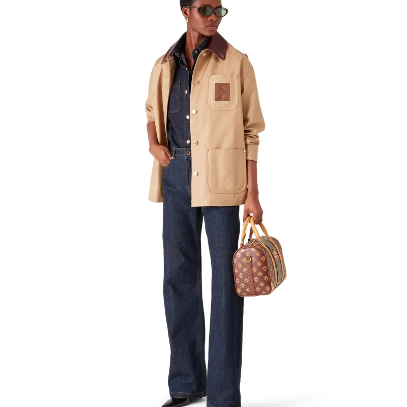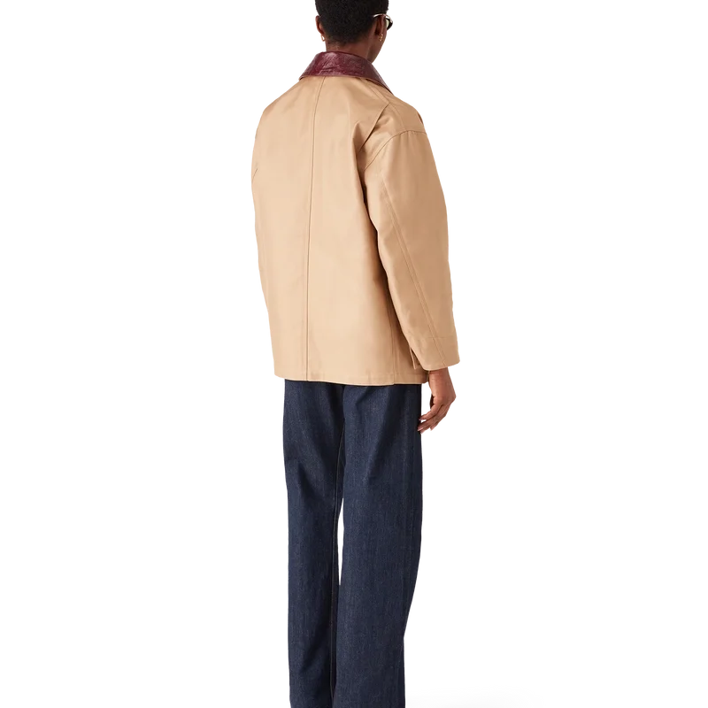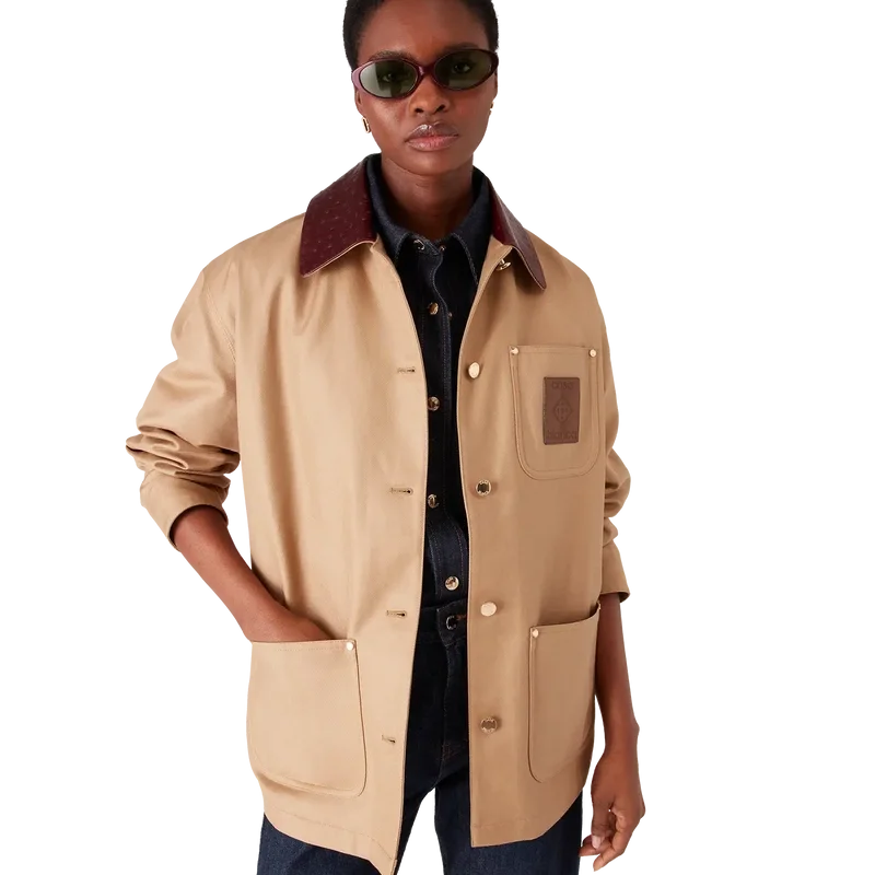 La giacca da lavoro beige è un modello dal taglio rilassato e disinvolto a maniche lunghe, realizzato in tessuto drill di cotone, che reinterpreta i codici utilitaristici attraverso la lente raffinata della Maison. Completata da colletto a contrasto, tasca sul petto con toppa in pelle con marchio, tasche applicate sul davanti, chiusura con bottoni e finiture placcate in oro.