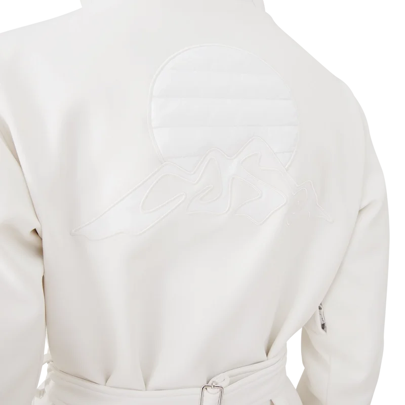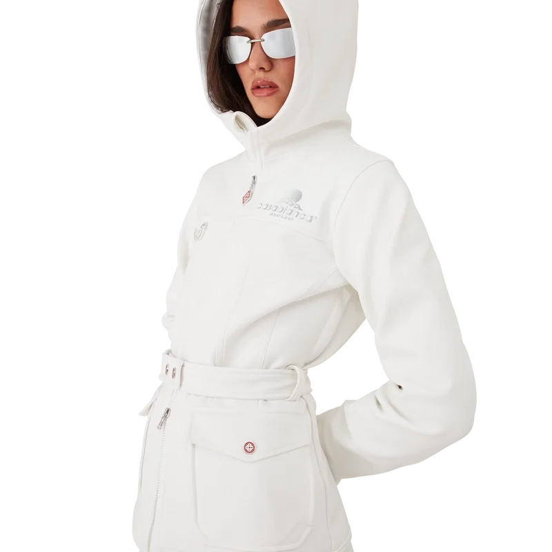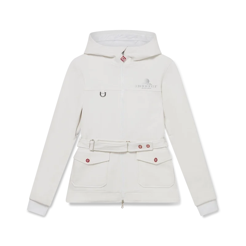 La giacca da sci è un capo di capispalla dal design raffinato, realizzato in tessuto felpato bianco, ispirato alle morbide texture della campagna invernale giapponese. Paesaggi ghiacciati e boschetti di bambù innevati creano sereni corridoi bianchi. Questo modello presenta sul retro la grafica stagionale Casa Montagne della Maison. Completata da un cappuccio con cordini e fermacordini con logo CC, un collo alto che offre ulteriore calore e protezione dalle intemperie, una chiusura con cerniera con la linguetta con il logo a diamante della Maison, tasche frontali con chiusura con dettagli in argento, cinturini regolabili con marchio e orlo e polsini elasticizzati.