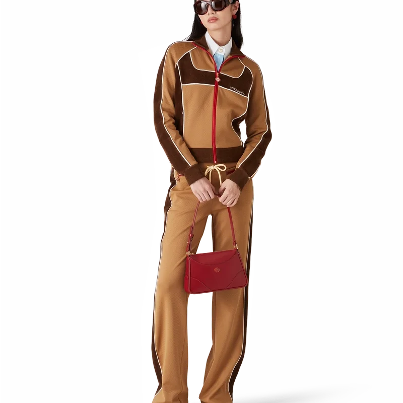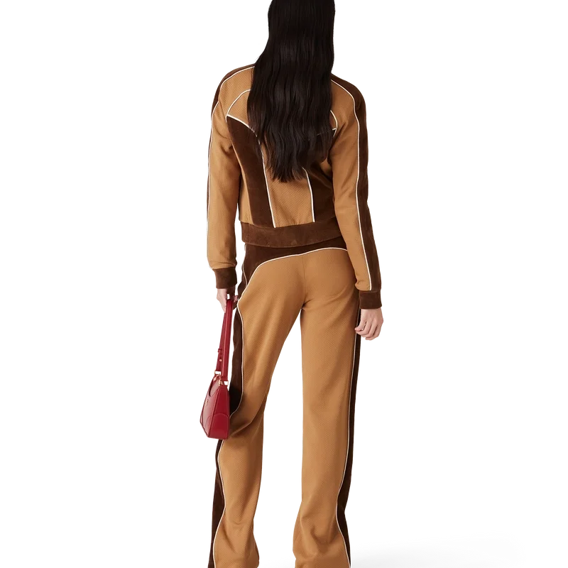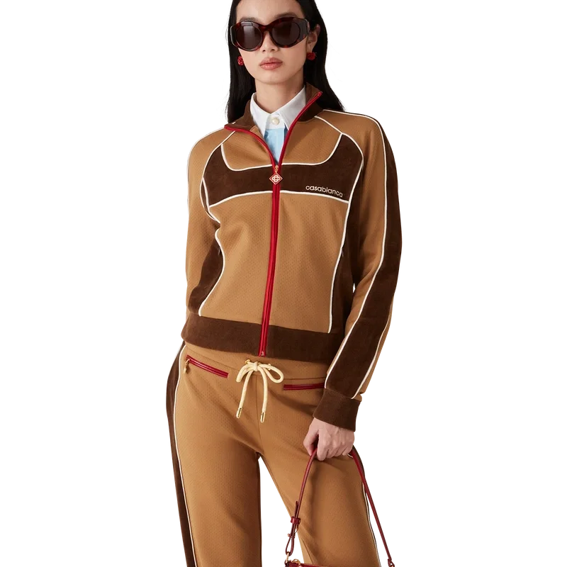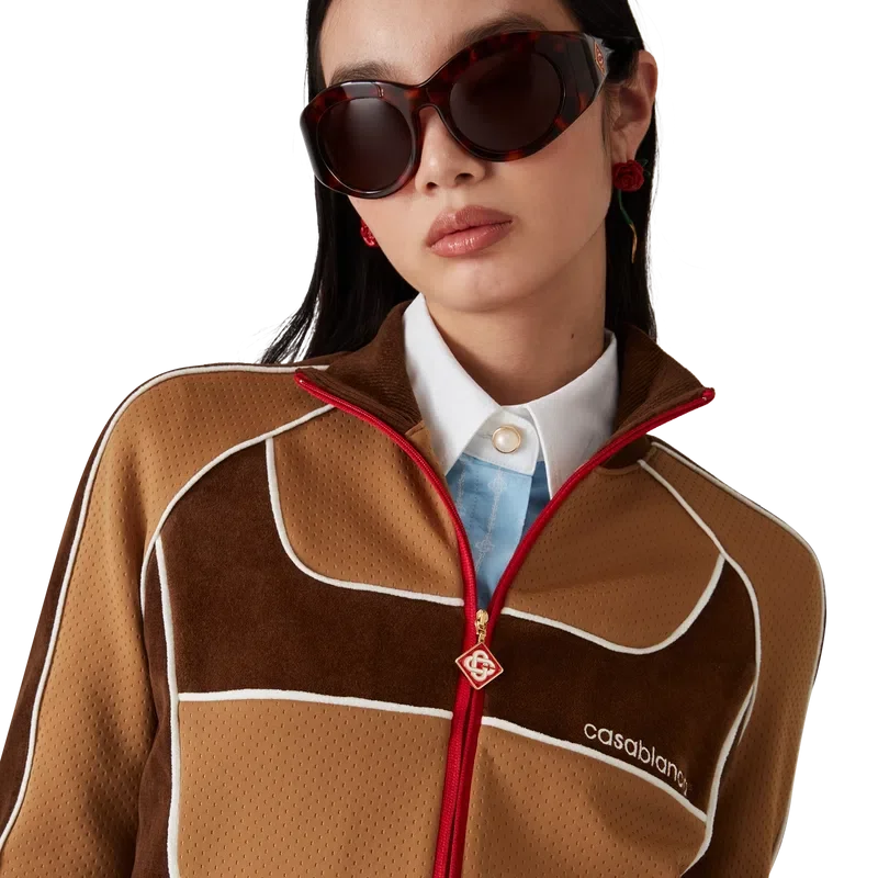 La giacca da tuta con inserti in ciniglia è un modello di ispirazione sportiva realizzato in tessuto tecnico velour e presenta il logo a rombi iconico della Maison sulla linguetta della cerniera. Completata da chiusura con cerniera, inserti con dettagli di bordino bianco e collo, polsini e orlo a costine.