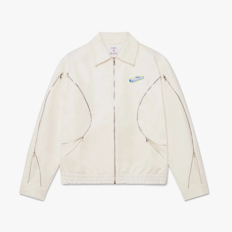 La giacca in cotone drill con zip bianca è un modello raffinato realizzato in resistente tessuto di cotone drill in un bianco brillante. Completata da una chiusura con zip con linguetta con il logo Warped della Maison, colletto a punta, tasche frontali con chiusura a zip, dettagli con zip sulle maniche e una silhouette comoda che incarna i codici sport-leisure della Maison.