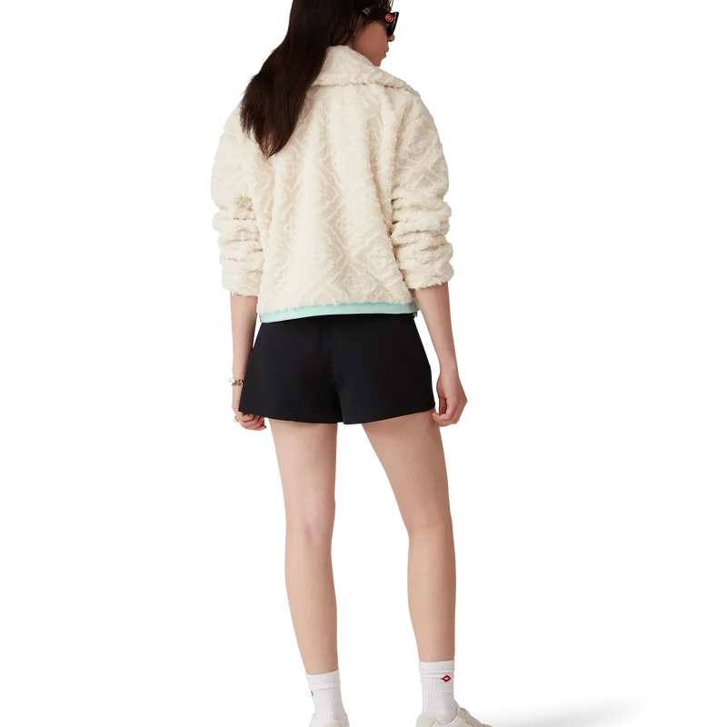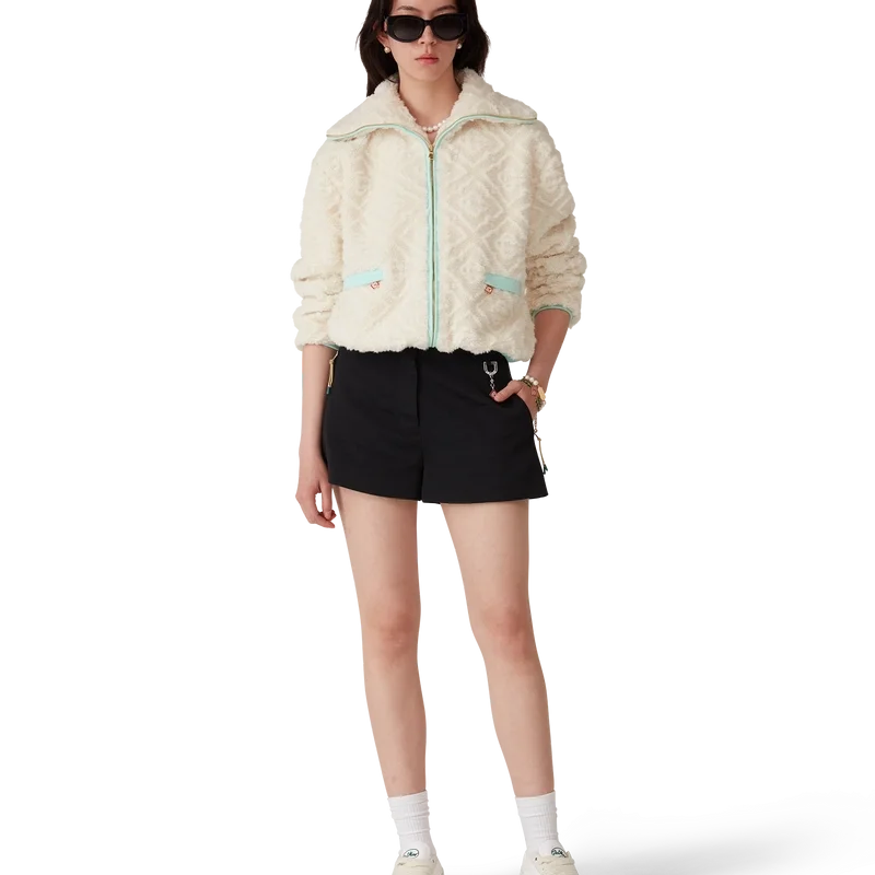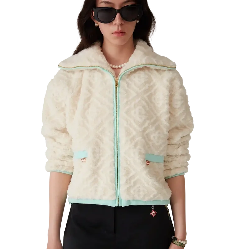 La giacca in pile jacquard Monogram è un modello a maniche lunghe dalla texture morbida, realizzato in tessuto in pile. È rifinita con collo a imbuto, chiusura con zip con linguetta con il logo a rombi iconico della Maison, polsini, orlo e bordo del cappuccio a costine in tonalità pastello e tasche con chiusura a zip.
