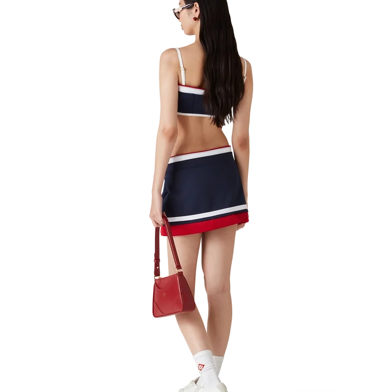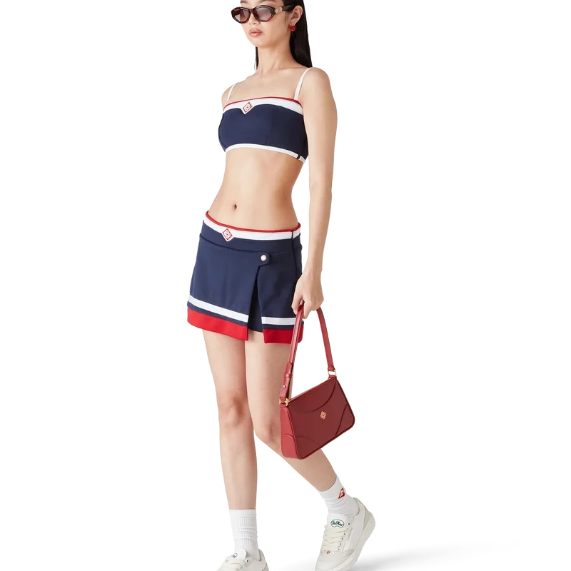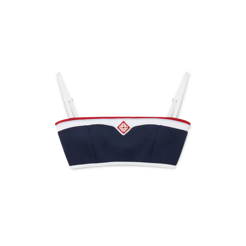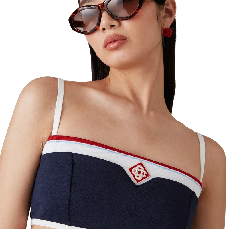 Il top a fascia in tricot è un modello senza maniche ispirato all’abbigliamento sportivo, caratterizzato dal Diamond Monogram, segno distintivo della Maison, al centro. Questo capo è realizzato in tessuto tricot, rifinito con spalline sottili e dettagli a strisce sui bordi.