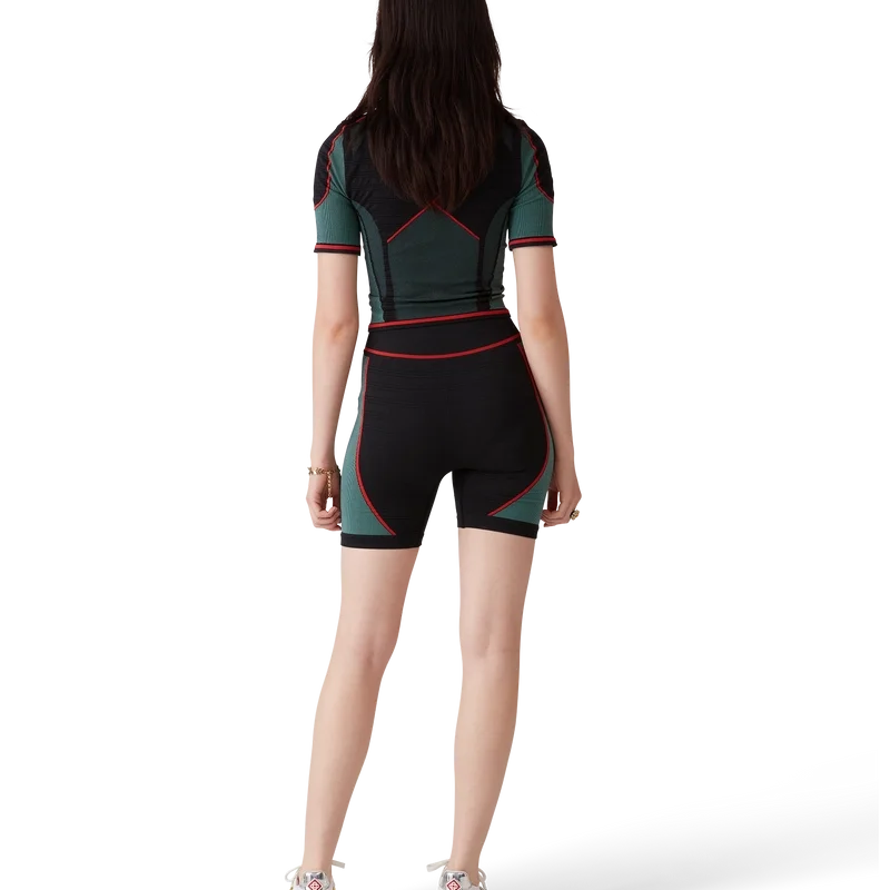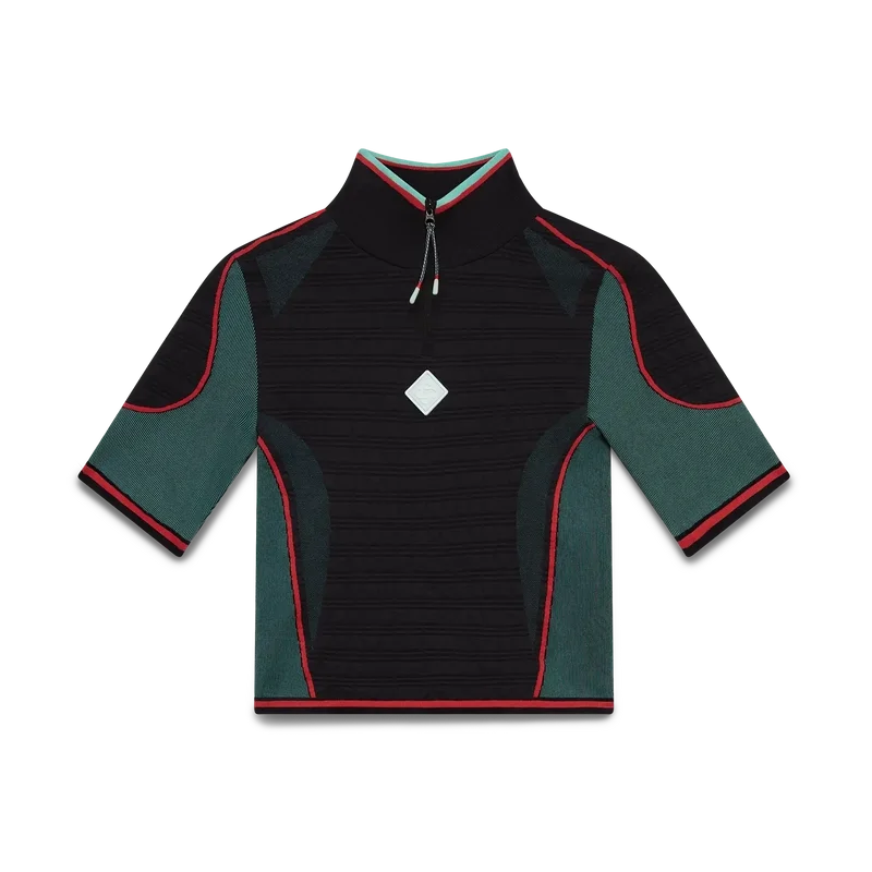La camicia senza cuciture con mezza zip è un modello a maniche corte di ispirazione sportiva, realizzato in tessuto elasticizzato a costine senza cuciture. Completa di chiusura con zip, collo a polo e presenta il logo a diamante della Maison e dettagli a pannelli.