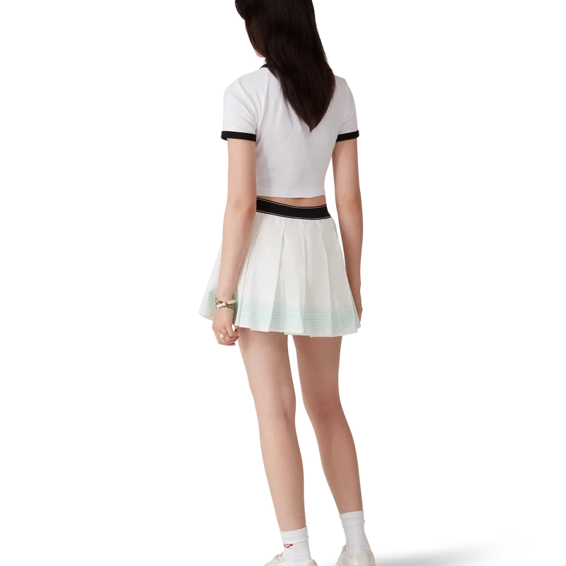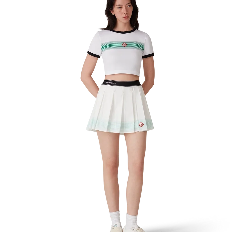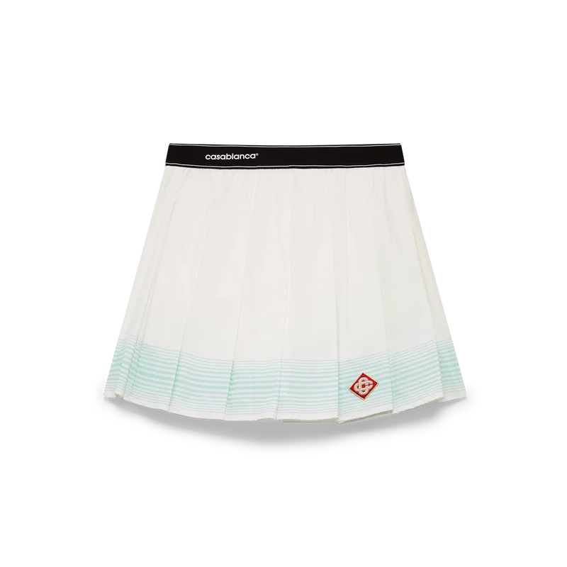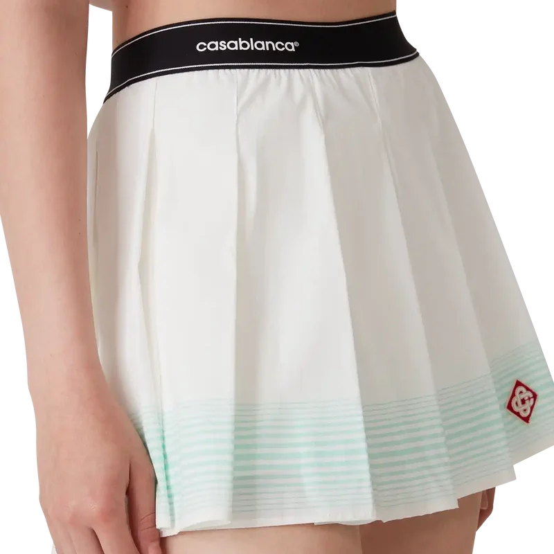 La minigonna plissettata a righe è un modello corto che presenta il logo a rombi iconico della Maison. Completata da una fascia elastica in vita a contrasto con logo Casablanca stampato a riquadri, dettaglio orlo a righe orizzontali sfumate verdi e pantaloncini interni aderenti.