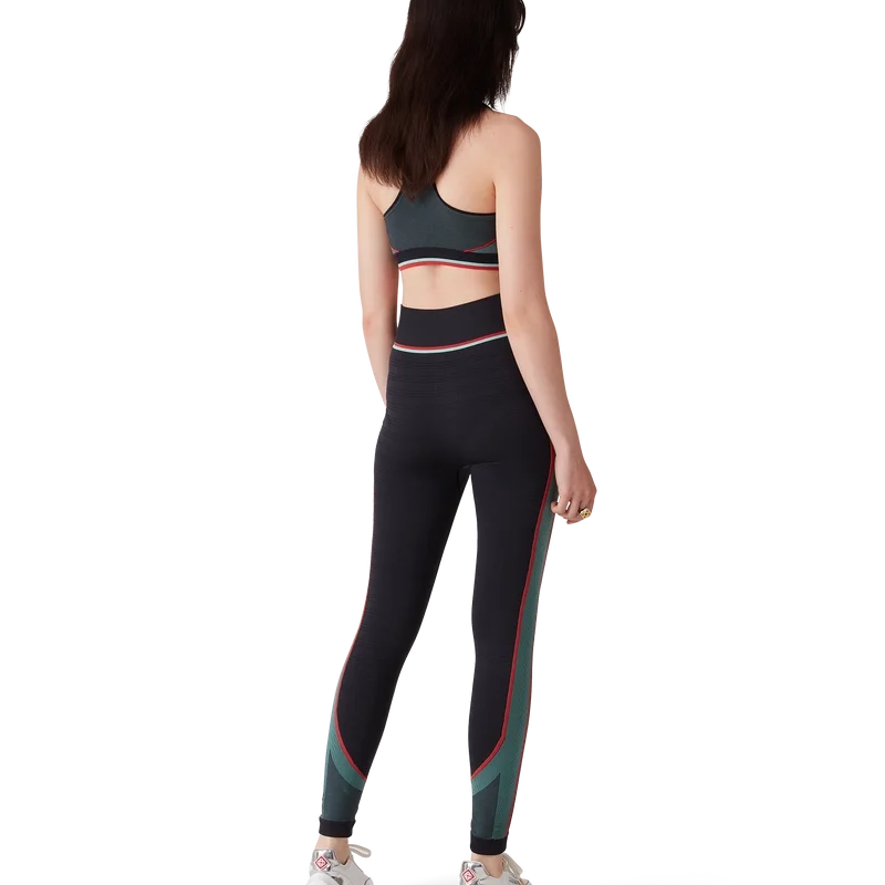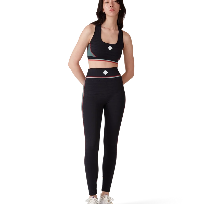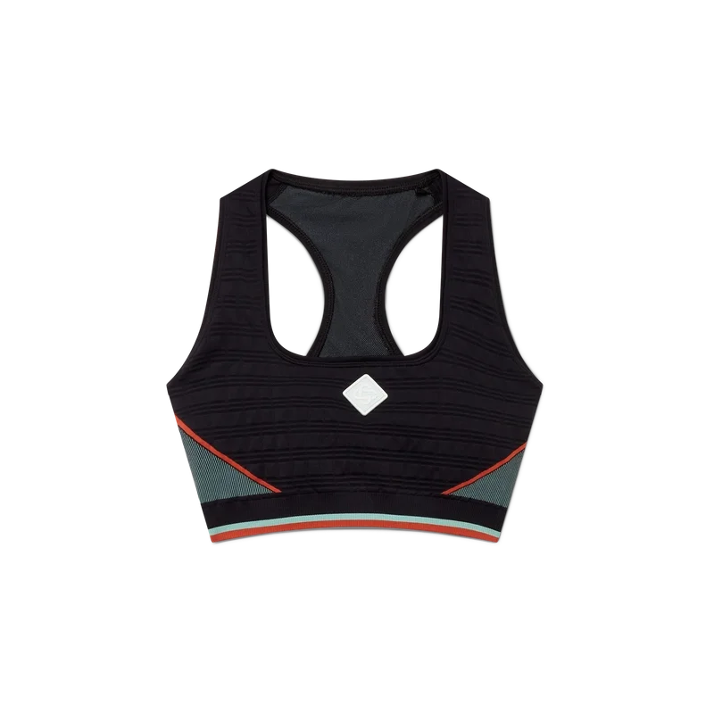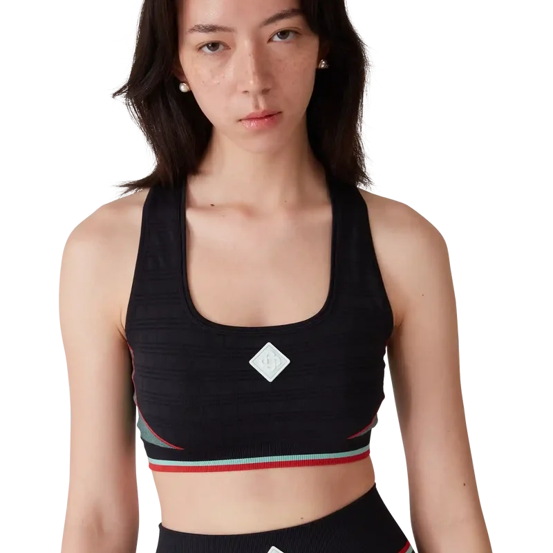 Il reggiseno sportivo senza cuciture è un modello ispirato all’abbigliamento sportivo, realizzato in tessuto elasticizzato a costine senza cuciture. Rifinito con una fascia elasticizzata, un dorso a vogatore, con il logo a diamante della Maison al centro e dettagli a pannelli.