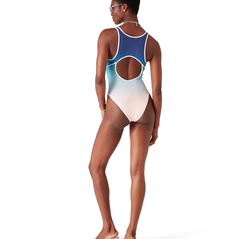 Il costume da bagno sfumato è un modello stampato realizzato in tessuto misto poliestere traspirante, caratterizzato dai colori sfumati di questa stagione. Completato da rifiniture bianche a contrasto, sgambatura alta, scollo rotondo e scollatura posteriore profonda, questo capo presenta il caratteristico rivetto CC intrecciato del marchio sul fianco.