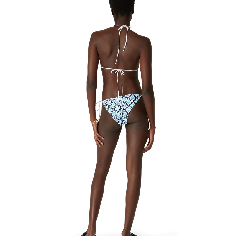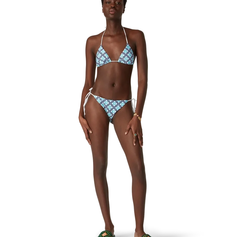 Lo slip del bikini Monogram è un modello stampato realizzato in tessuto tecnico traspirante, caratterizzato da un monogramma sfumato che offre una rivisitazione della stampa iconica di Casablanca. Rifinito con bordi bianchi e chiusura a lacci, questo capo presenta il rivetto CC intrecciato iconico della Maison ed è pensato per essere indossato con il top coordinato.