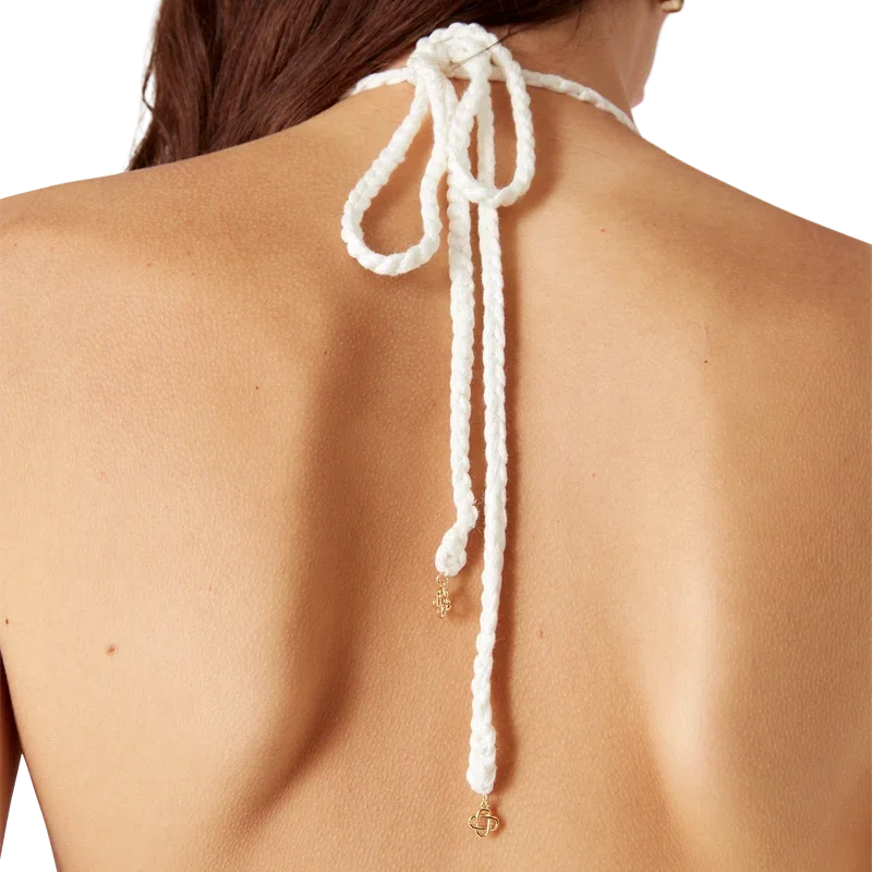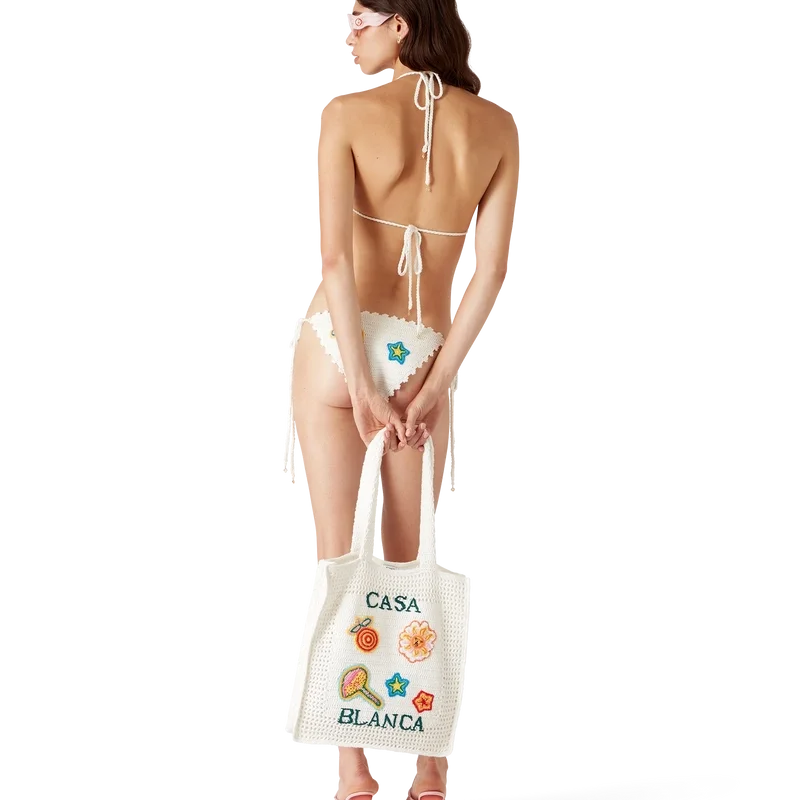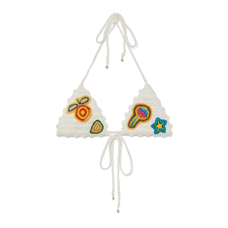 Il top bikini all’uncinetto con motivi è un modello triangolare realizzato in tessuto all’uncinetto. Rifinito con motivi che richiamano gli elementi di design classici della Maison e lacci sul collo e sulla schiena. Questo capo è dotato di imbottitura rimovibile ed è pensato per essere indossato con lo slip coordinato.