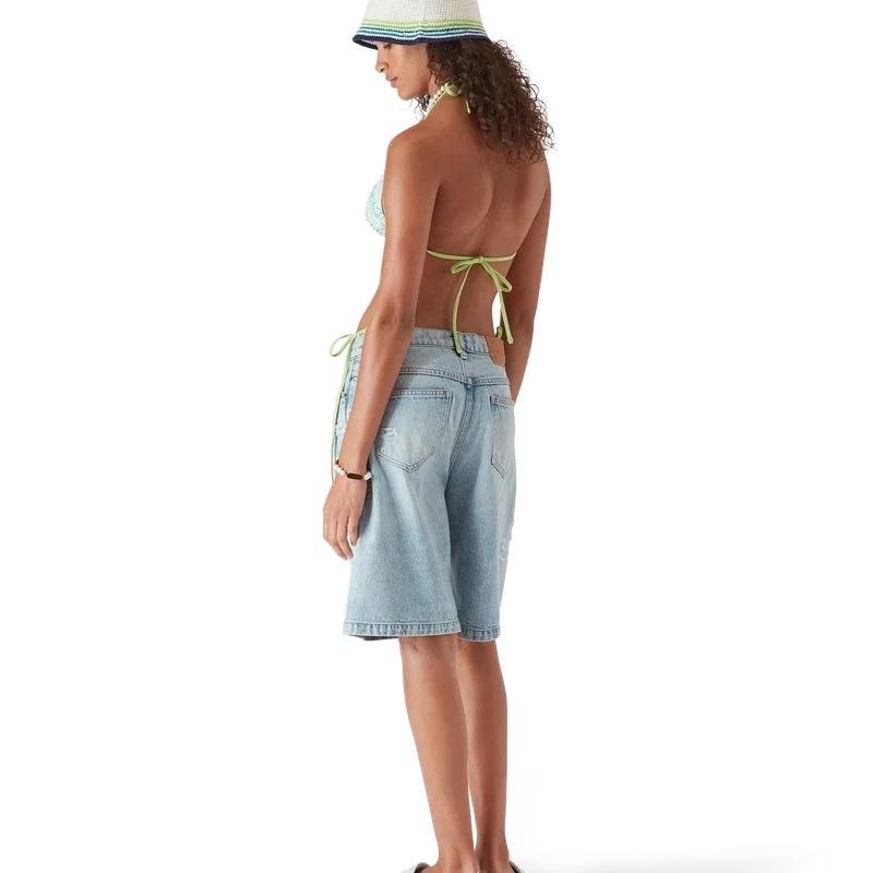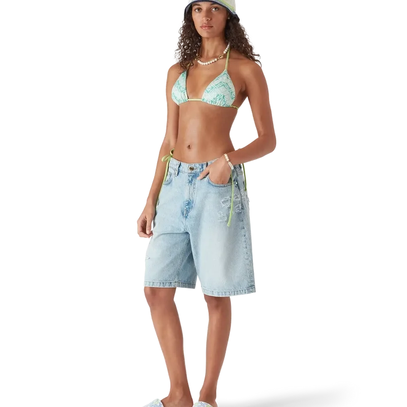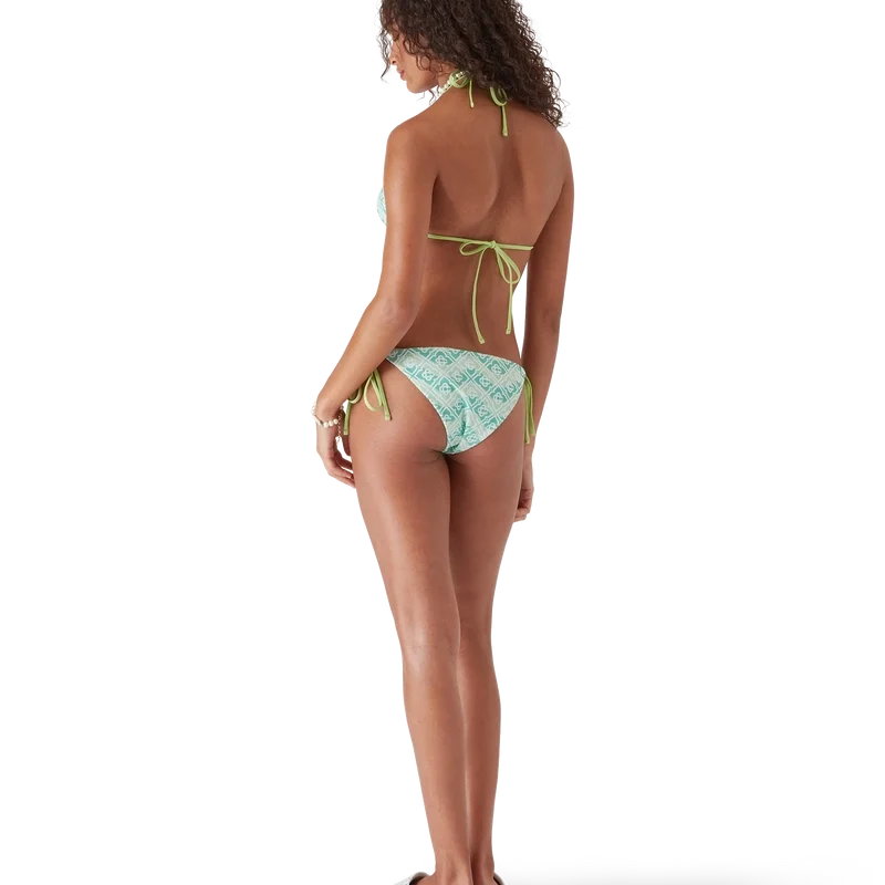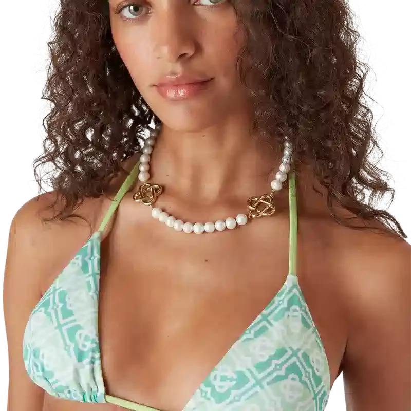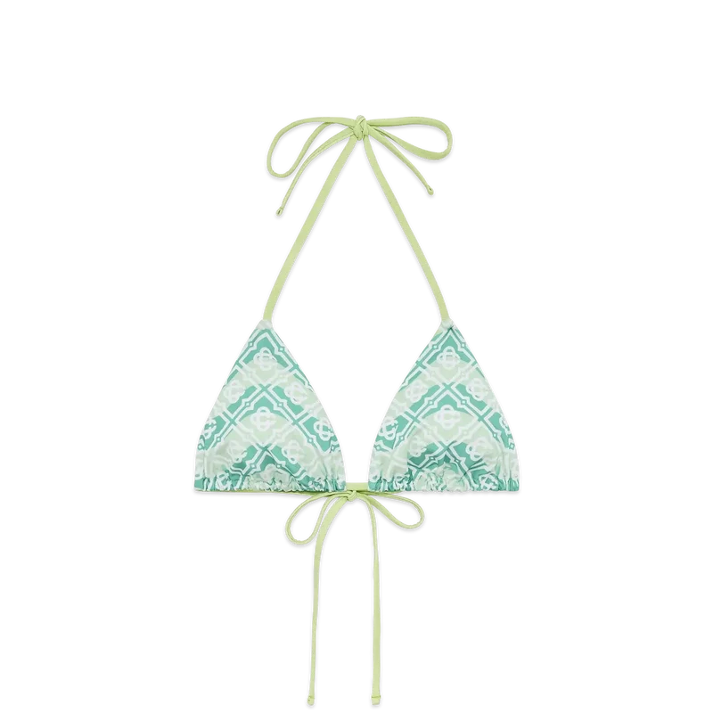Il top bikini a triangolo con lacci e monogramma ondulato presenta un design raffinato caratterizzato dal motivo Monogram della Maison su uno sfondo ispirato alle onde di Memphis. Completato da lacci con punte dorate, coppe rimovibili e il caratteristico rivetto CC intrecciato placcato oro della Maison sulla coppa sinistra, questo capo è pensato per essere indossato con lo slip abbinato.