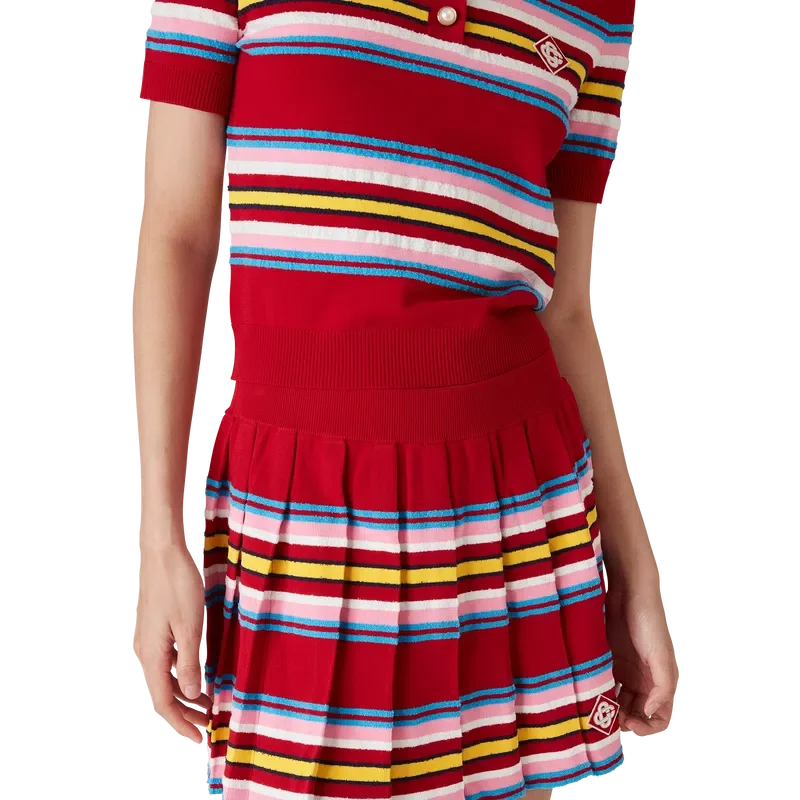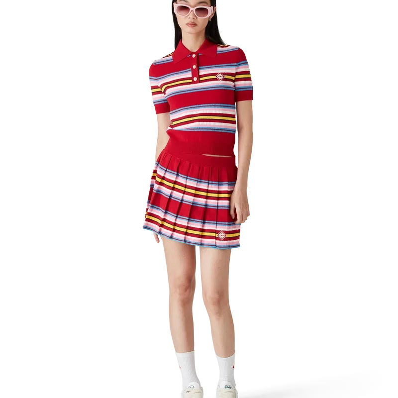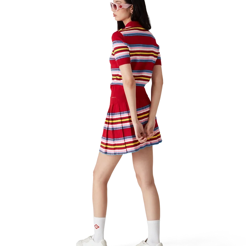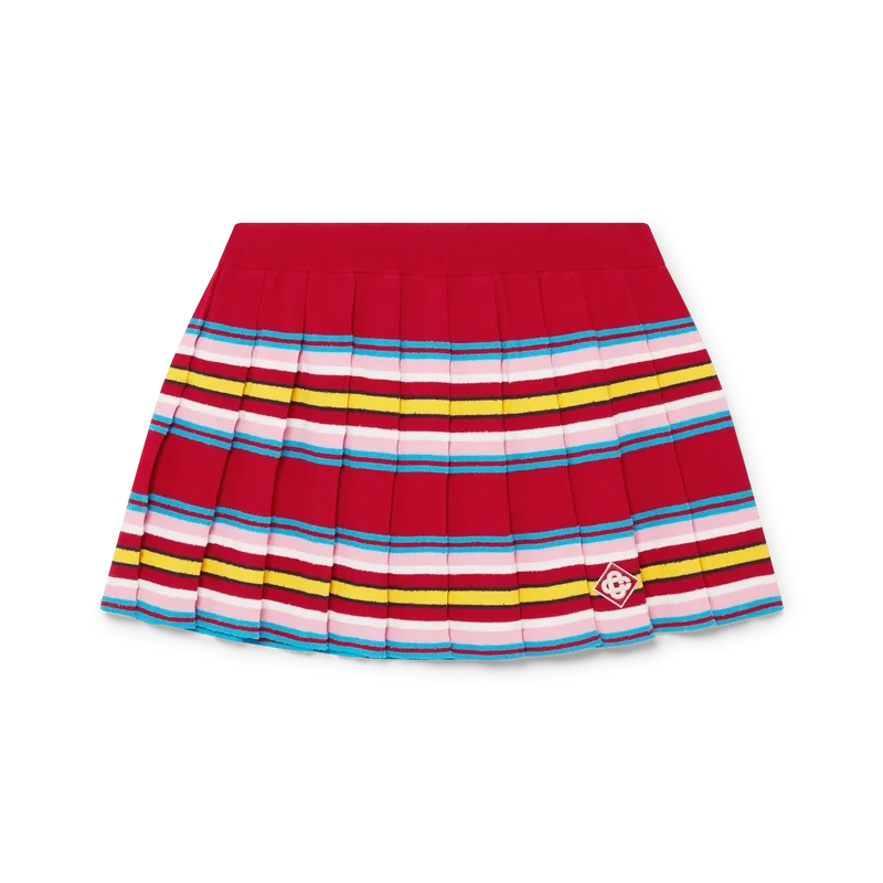 La gonna a pieghe a righe è un modello mini realizzato in tessuto a righe. Completa di elastico in vita, pieghe, righe orizzontali verdi, rosa e blu, chiusura con cerniera laterale e pantaloncini integrati.