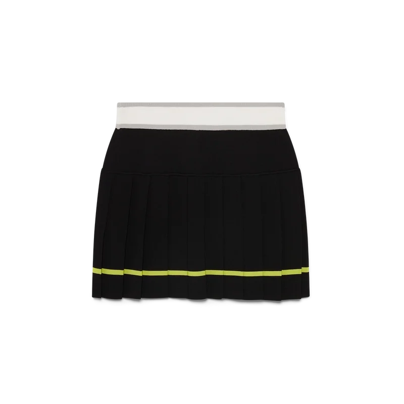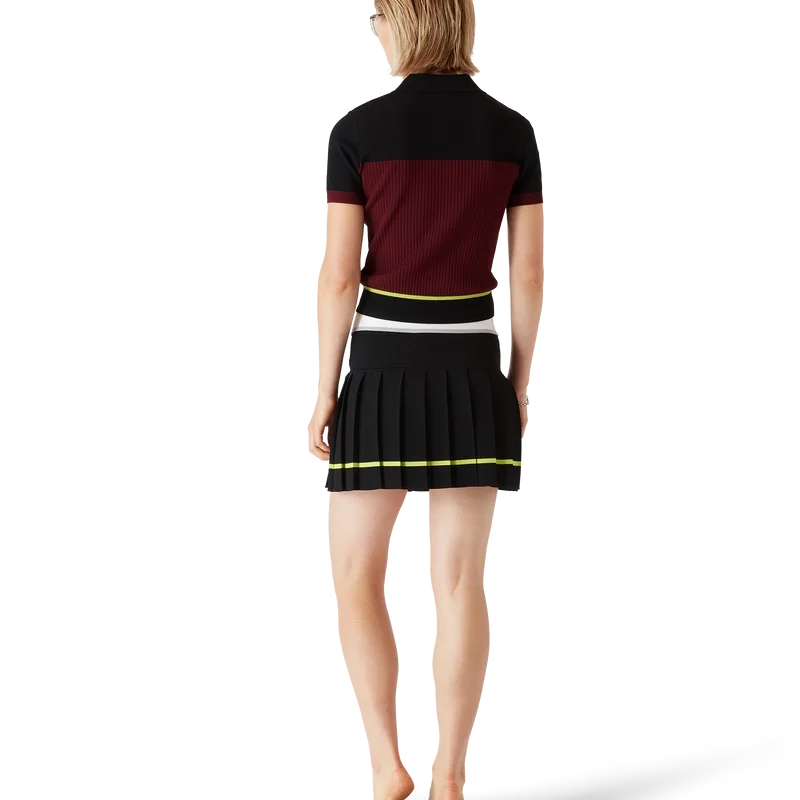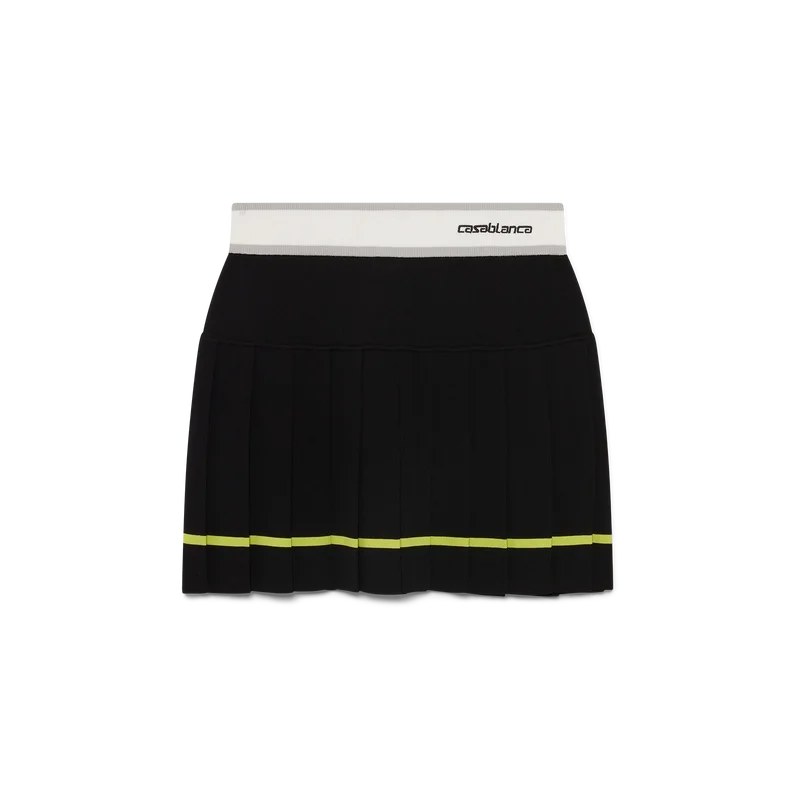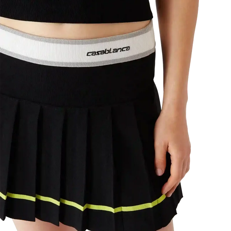 La gonna a pieghe a righe è un modello mini, con una silhouette strutturata che riflette l’approccio da atelier della Maison all’abbigliamento sportivo. Completata da una cintura elasticizzata con il logo Casablanca, un carré a tinta unita e un pannello a pieghe con dettaglio di orlo a righe gialle.