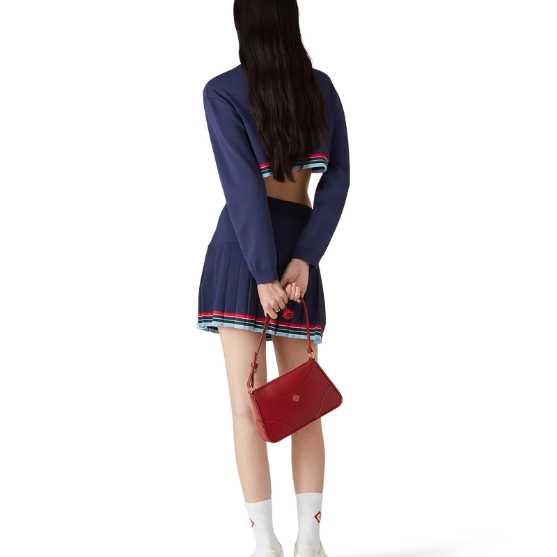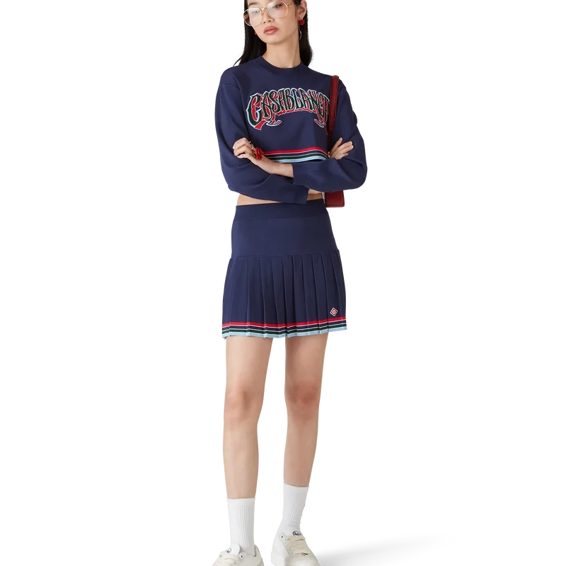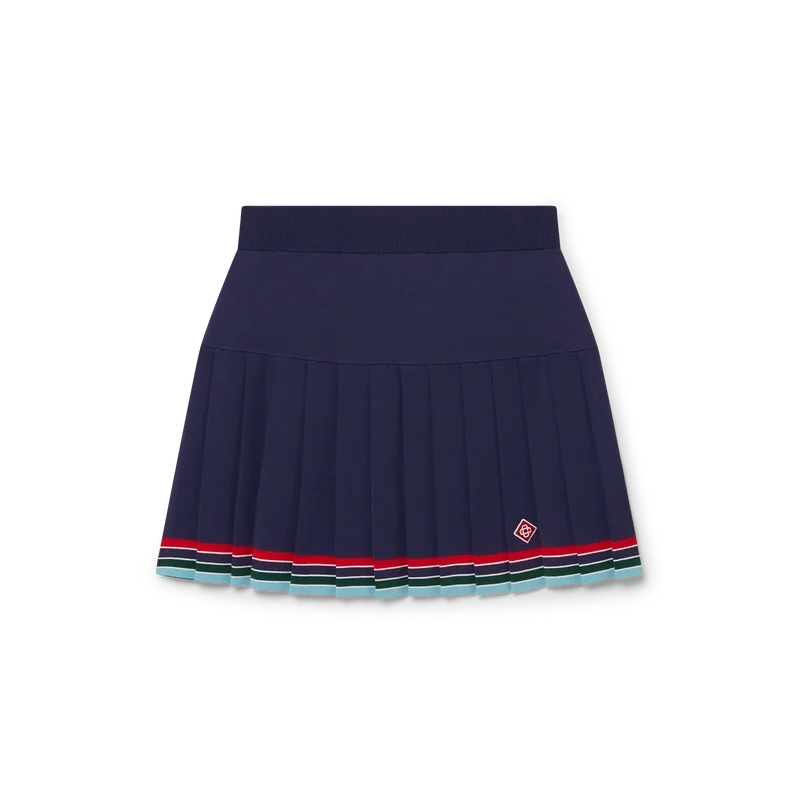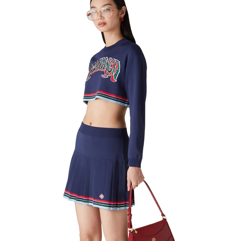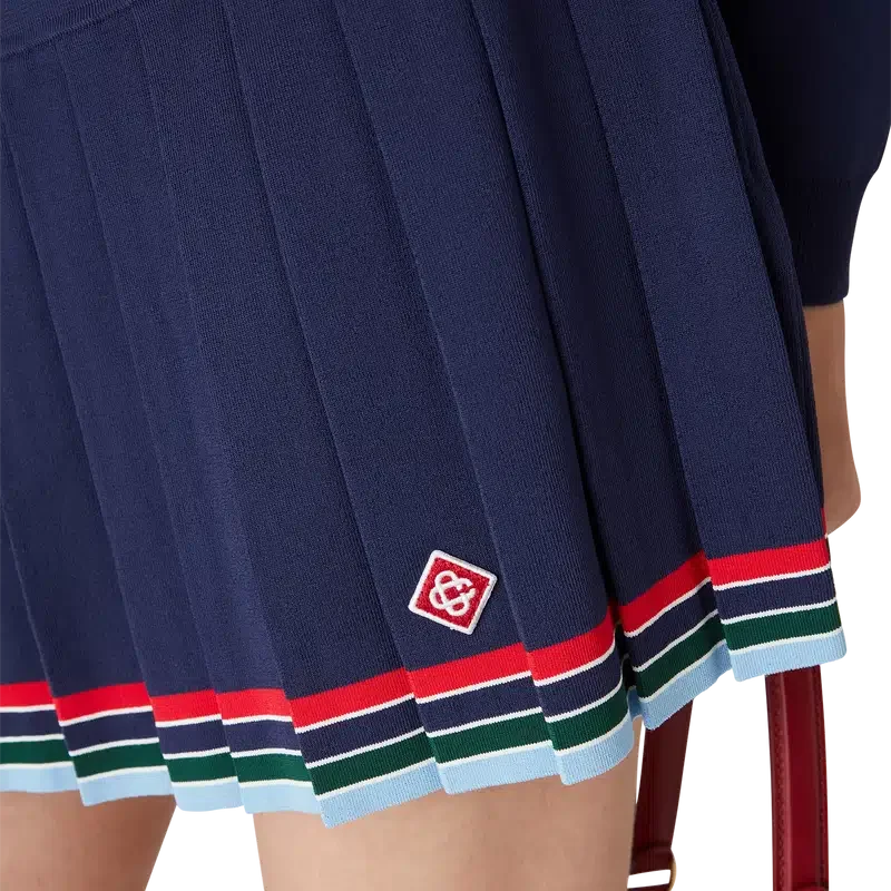La gonna a pieghe stile baseball è un modello mini realizzato in tessuto tricot. Rifinita con cintura, pieghe e dettagli a righe orizzontali rosse, bianche, blu, verdi e blu navy sull’orlo.