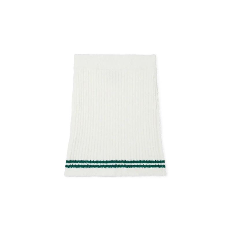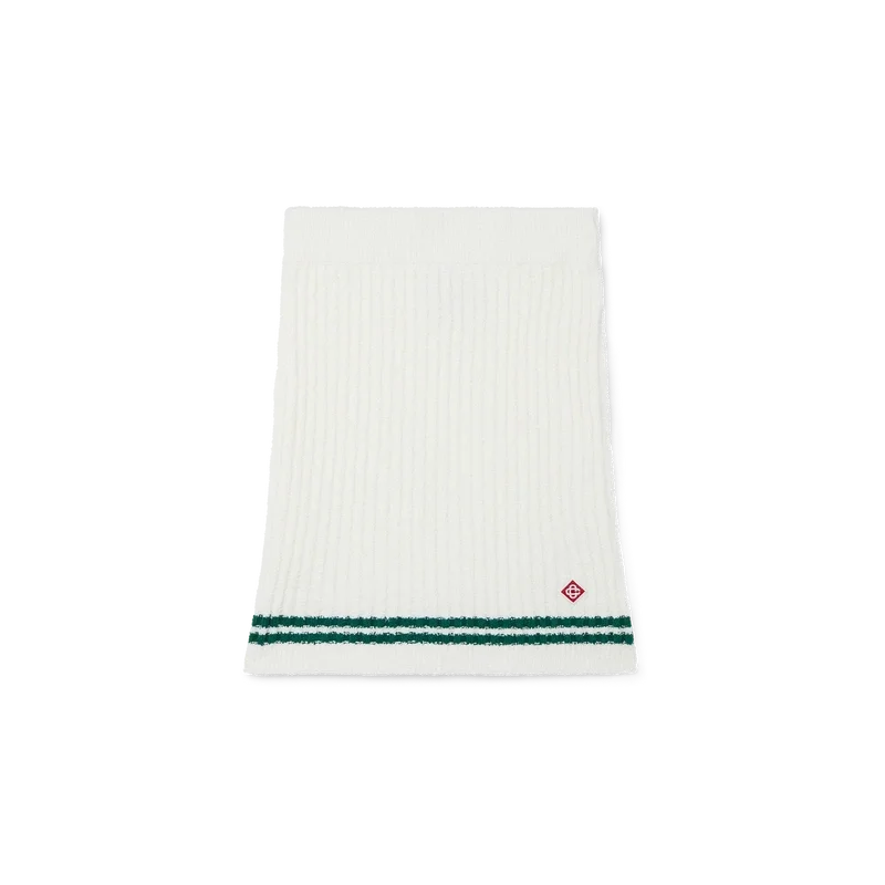 La minigonna in maglia bouclé bianca è un modello lavorato a maglia con una serie di strisce verdi lungo l’orlo. Rifinita con una cintura elasticizzata, la maglia mista cotone e nylon è pensata per vestire in vita e per essere indossata con una vestibilità slim.