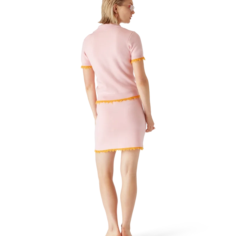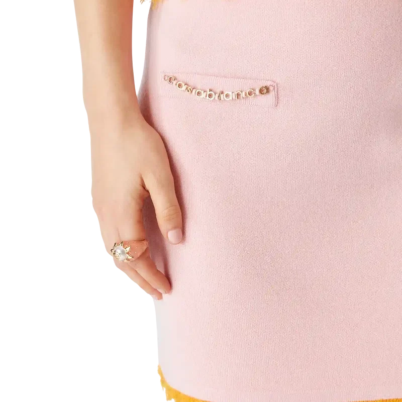 La minigonna in lana merino è un modello aderente realizzato in tessuto di lana merino con silhouette ad A. Completa di tasche a filetto e bordi sfrangiati.