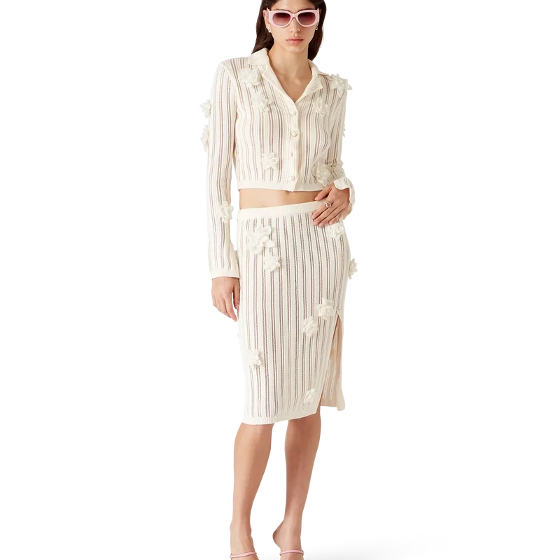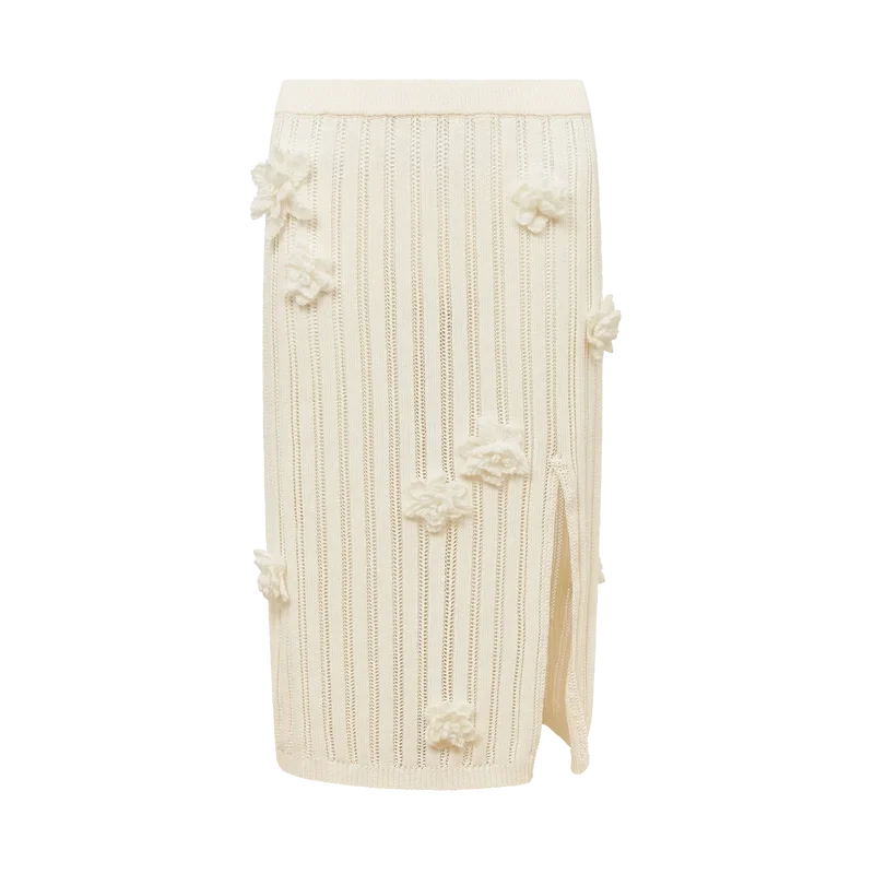 La gonna in maglia di pizzo a fiori è un modello al ginocchio realizzato in tessuto di cotone a maglia di pizzo. Rifinita con una cintura in elastico a costine, uno spacco e applicazioni con motivi floreali.