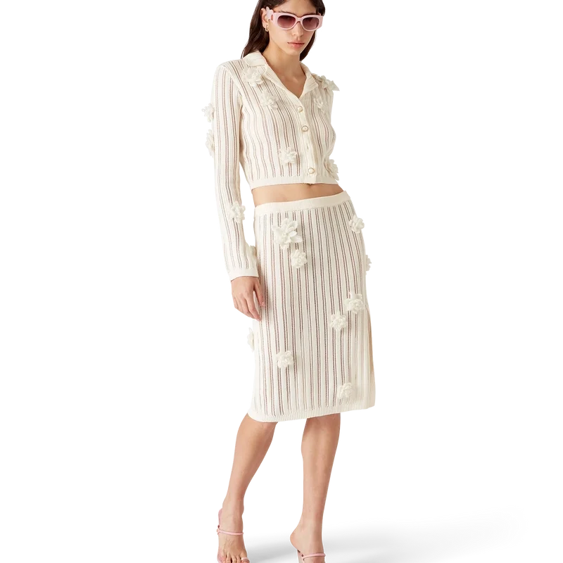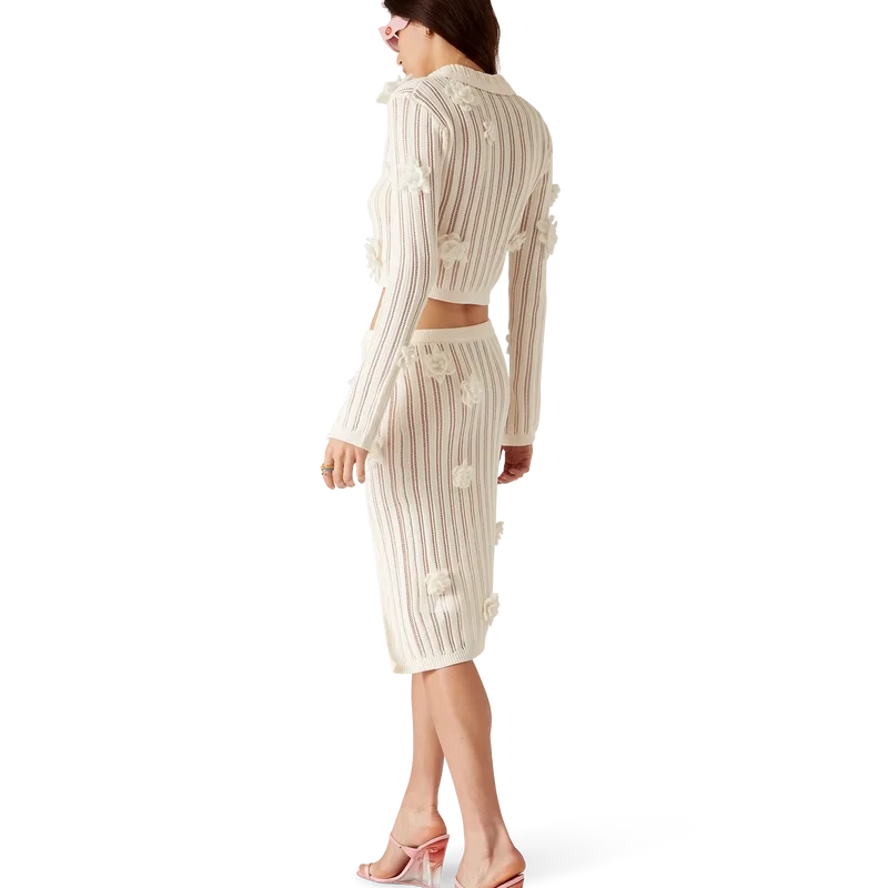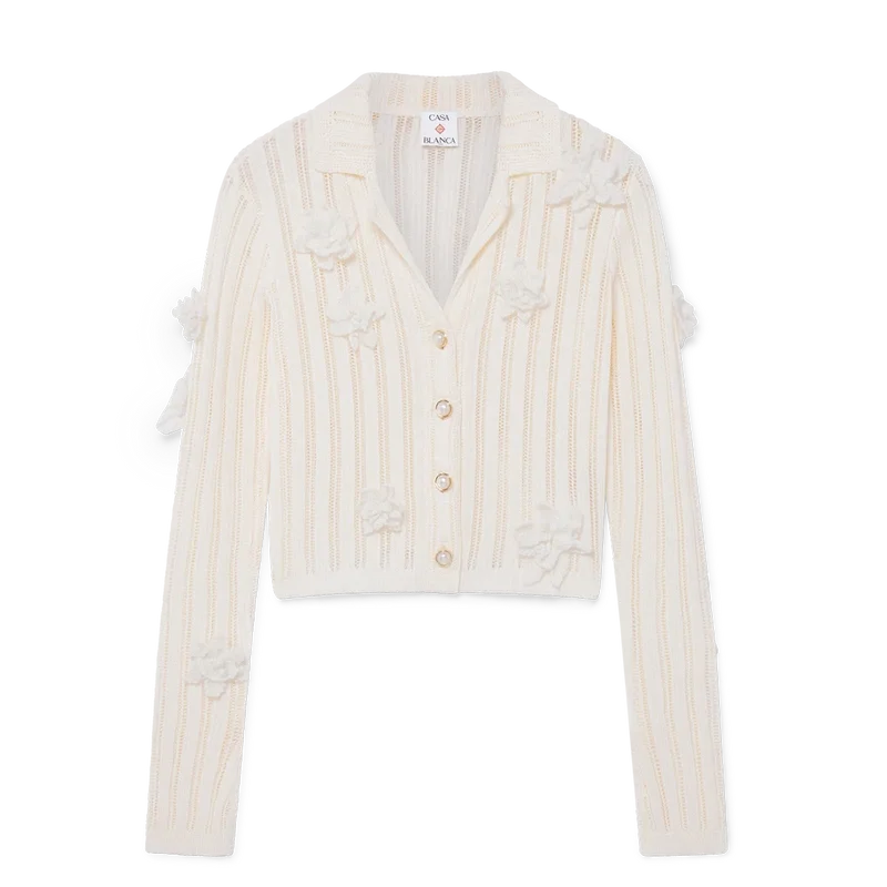 La camicia in maglia di pizzo floreale è un modello a maniche lunghe realizzato in tessuto di cotone a maglia di pizzo. Rifinita con maniche a campana con dettaglio a spacco, colletto, chiusura con bottoni, bottoni in oro con bordo in perla e applicazioni con motivi floreali.