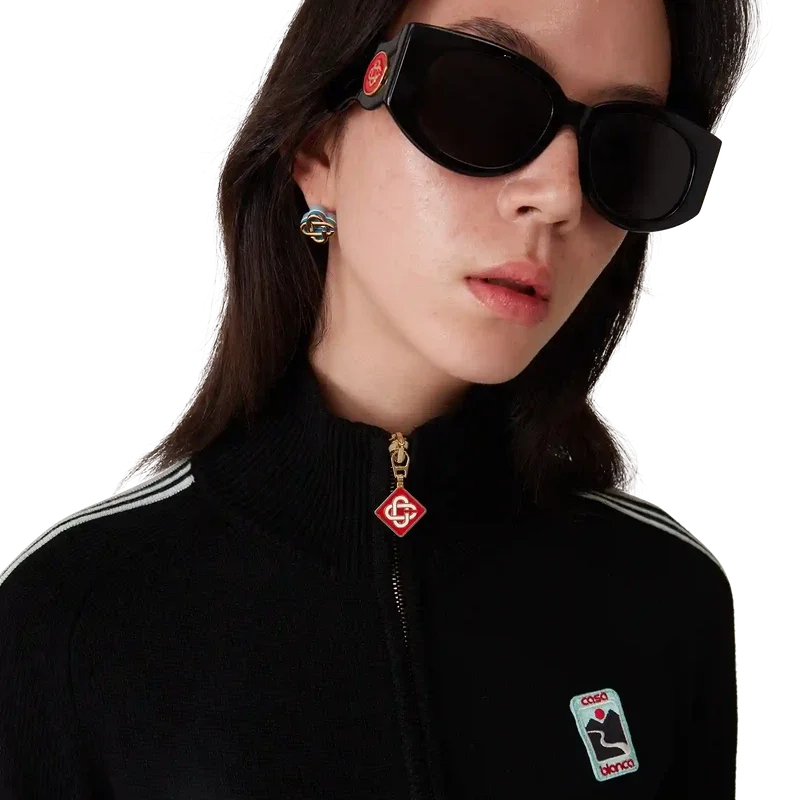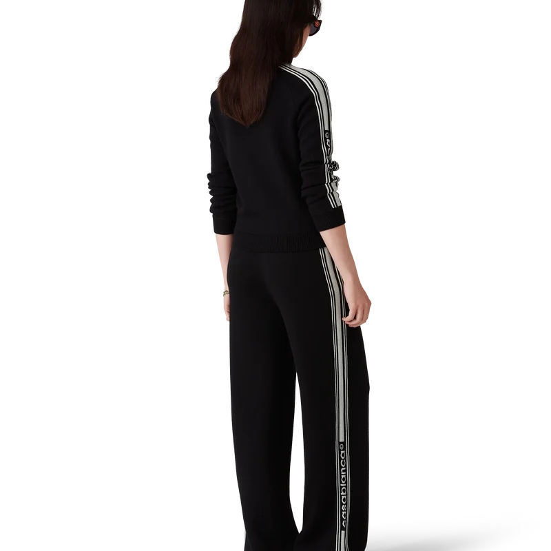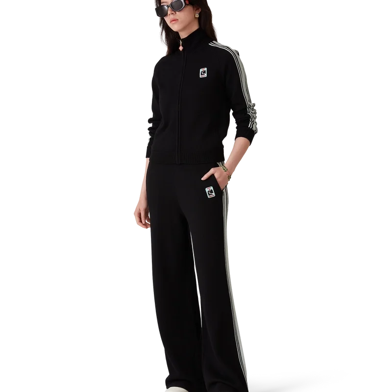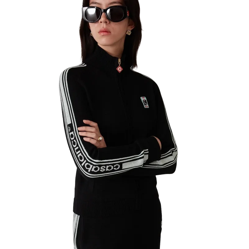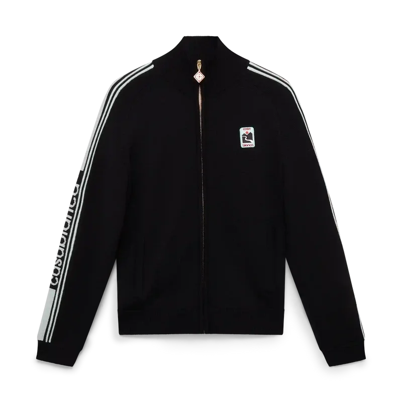 La giacca da tuta in maglia merino è un modello a maniche lunghe realizzato in tessuto di lana merino. Rifinita con dettagli a costine sui polsini e sull’orlo, abbottonatura a contrasto, collo a imbuto, chiusura frontale con zip, dettagli a strisce lungo le maniche e logo Casablanca.