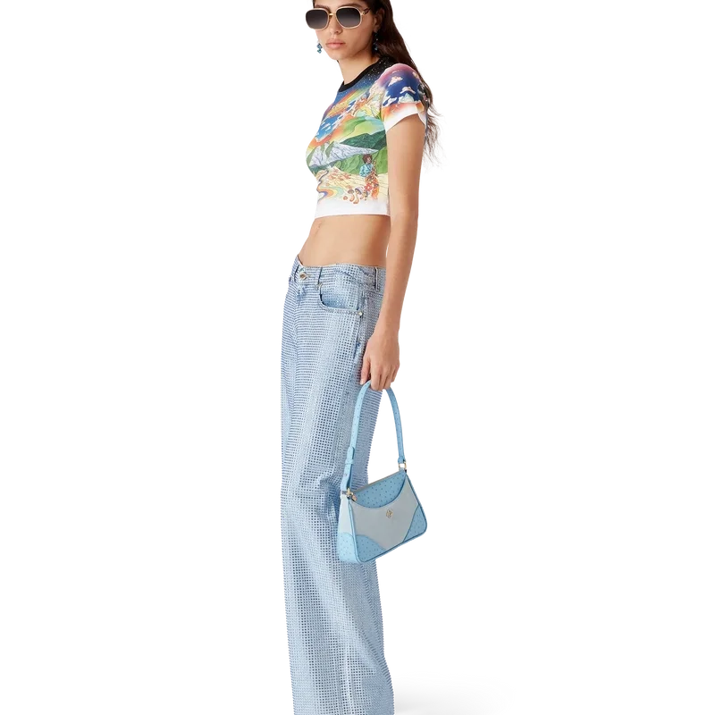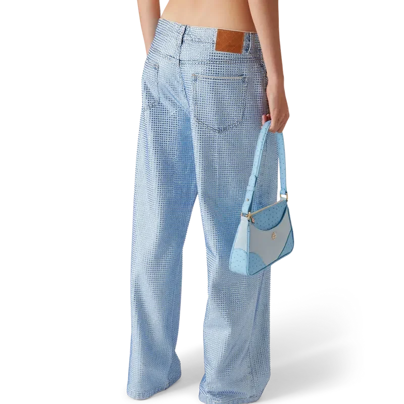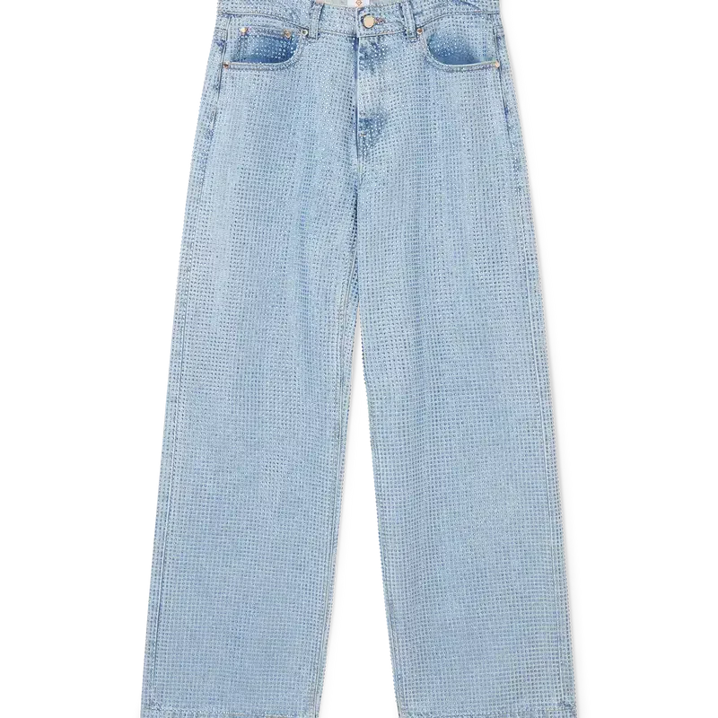 I jeans con decorazioni in cristallo presentano un taglio dritto, sono realizzati in tessuto di cotone e presentano cristalli Hotfix in un motivo all-over. Completati da dettagli placcati in oro, passanti per cintura, tasche anteriori e posteriori, toppa in pelle con marchio e chiusura con zip.