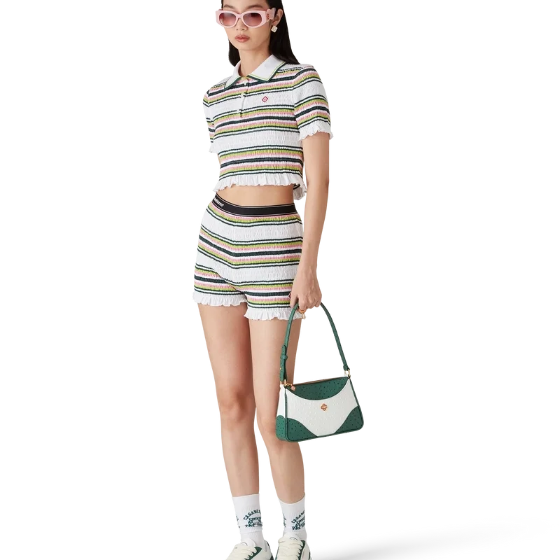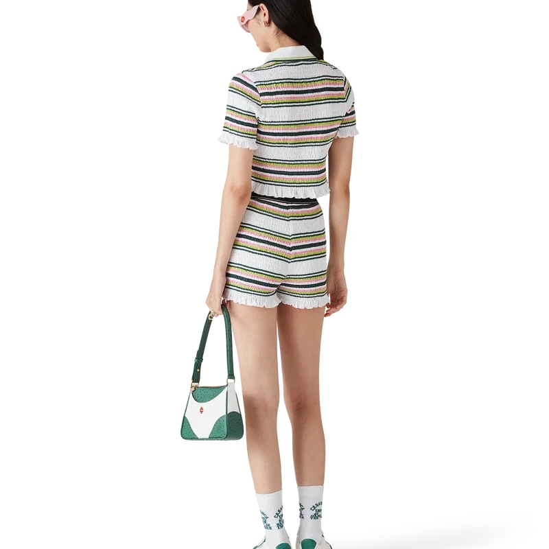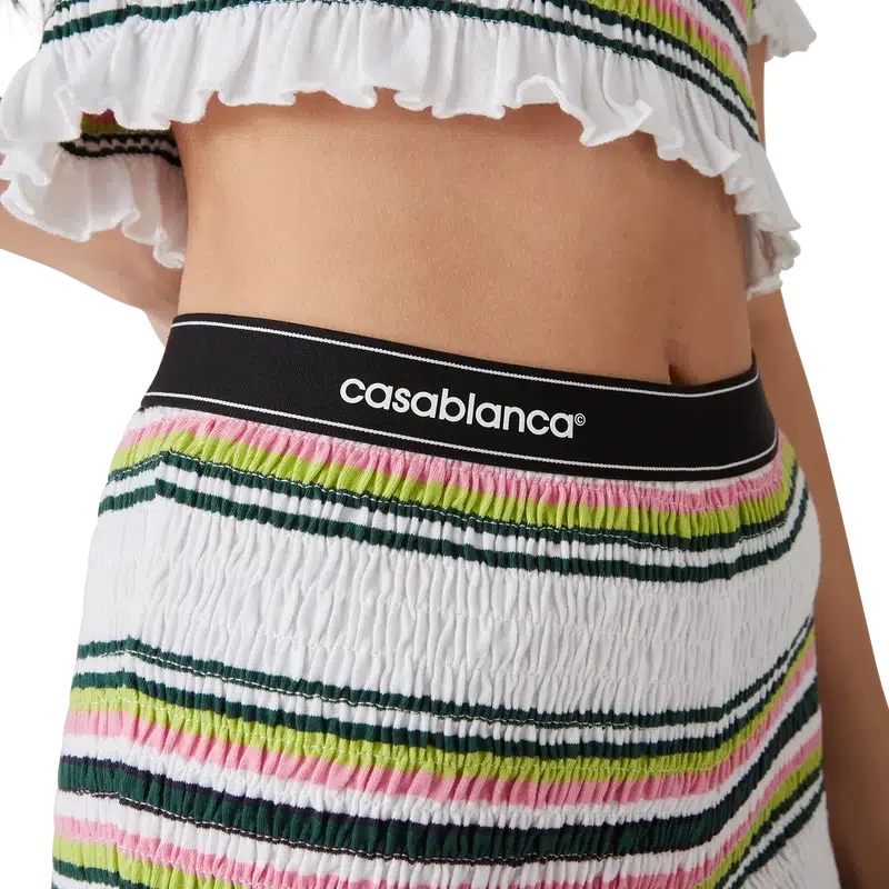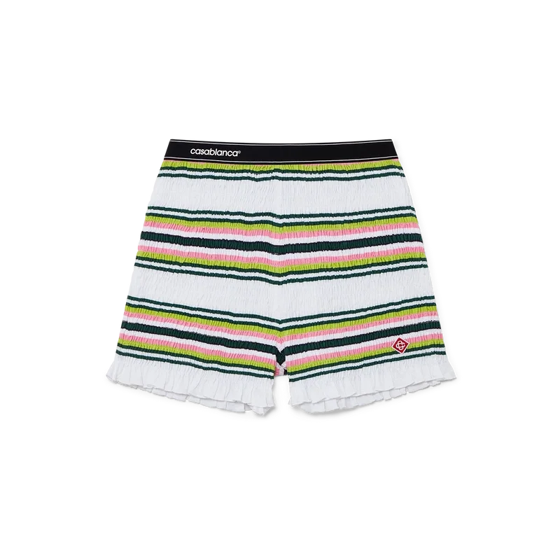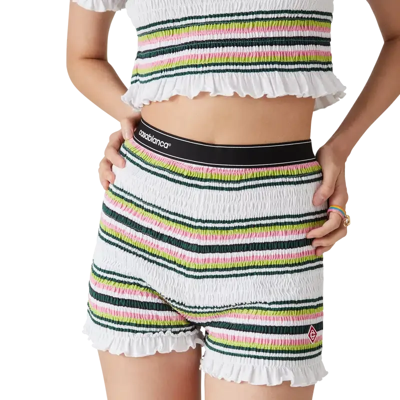 I pantaloncini a righe arricciati sono un modello corto realizzato in tessuto di cotone arricciato che presenta il logo a rombi iconico della Maison. Completati da una cintura in nastro elasticizzato con il logo Casablanca e dettagli sui bordi, e da volant sull’orlo.