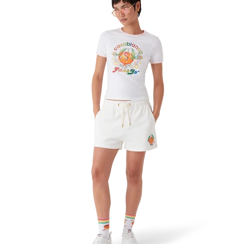 I pantaloncini da tennis trapuntati con mascotte presentano un disegno ricamato, realizzati in tessuto trapuntato a motivo a griglia con una grafica stagionale della pallina da tennis kawaii – questo personaggio è una parte fondamentale del nostro universo. Incorpora elementi come la foglia d’alloro, la sneaker Atlantis, la racchetta e gli occhi kawaii. Abbiamo scelto di mettere in primo piano questo personaggio come motivo centrale per tutti i modelli da uomo della collezione. Completati da elastico in vita, chiusura con coulisse, tasche interne e tasca posteriore a patch Anda.