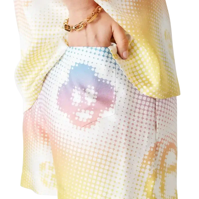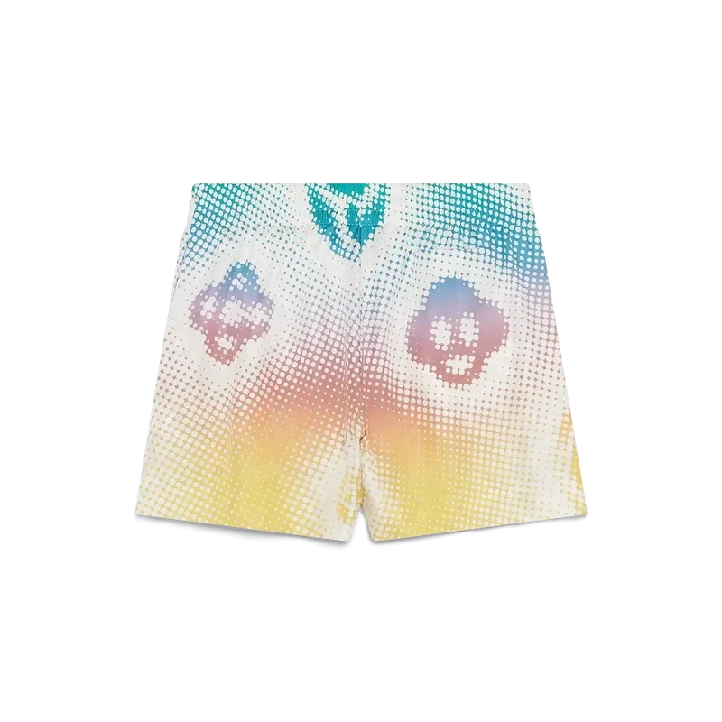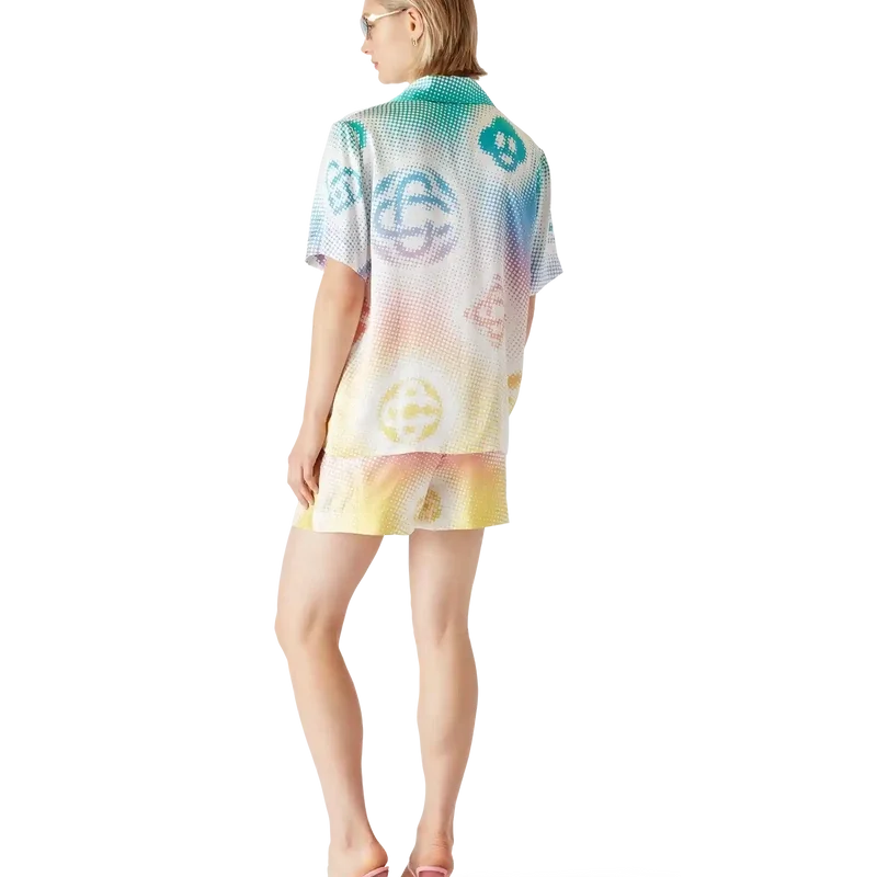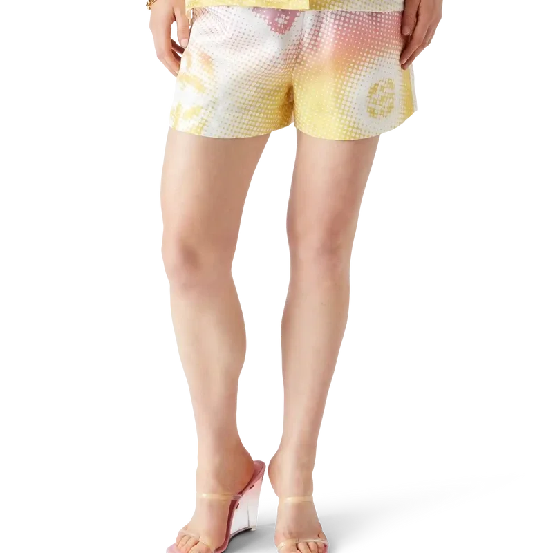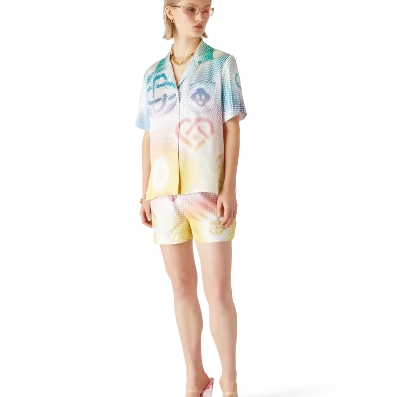 I pantaloncini in seta con logo in mezzitoni presentano una stampa all-over con i monogrammi della Maison realizzati con la tecnica dell’aerografia, sulla base delle nostre precedenti sperimentazioni con questa tecnica. Sono rifiniti con una cintura elasticizzata, una tasca applicata sul retro e tasche laterali interne.