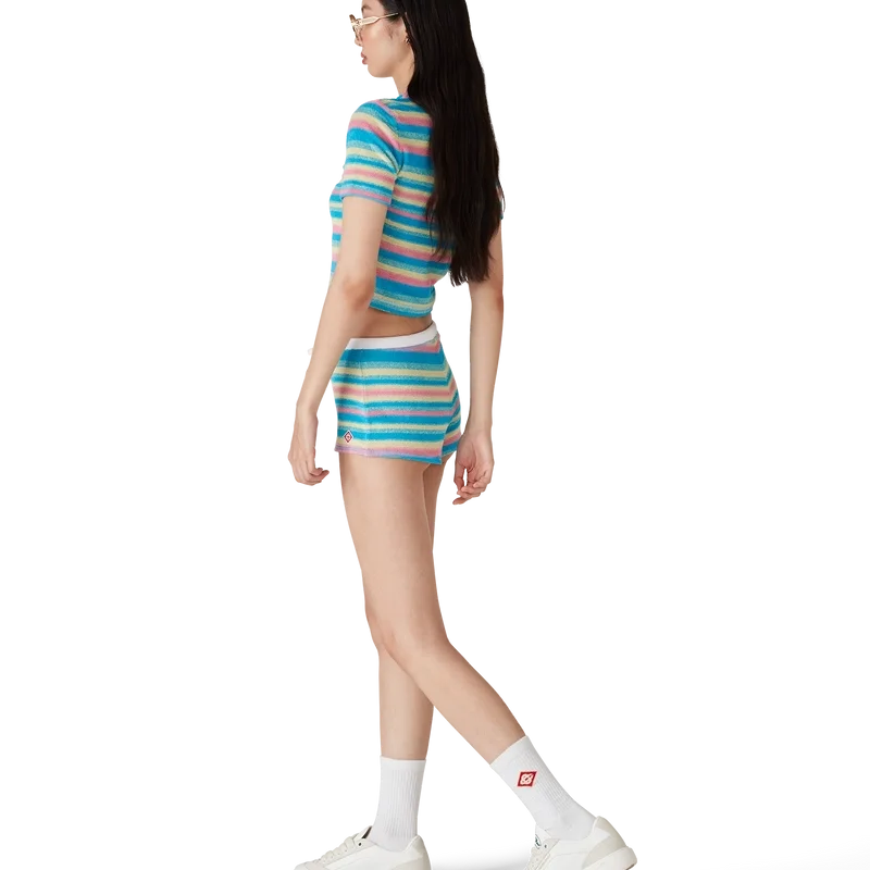 I pantaloncini in spugna a righe sono un modello corto realizzato in tessuto spugna. Sono rifiniti con una cintura elasticizzata a contrasto, chiusura con coulisse e presentano il logo a rombo iconico del marchio.