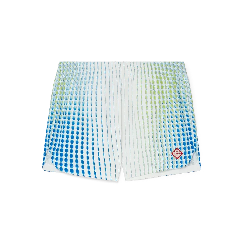 Questi pantaloncini in taffetà di poliestere stampato presentano un design classico caratterizzato dalla toppa con il logo a rombi, simbolo della Maison, e da un’esclusiva grafica realizzata in collaborazione con Martin Naumann, noto per i suoi lavori con sfumature e effetti materici. Sono rifiniti con elastico in vita, chiusura con coulisse, fodera, tasche laterali e orlo arrotondato.