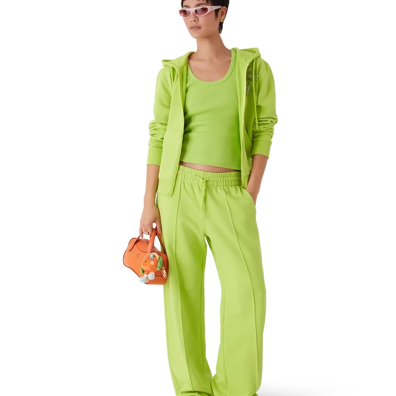 I pantaloni della tuta con orlo aperto sono un capo sportivo realizzato in tessuto di cotone biologico color lime con due spille a forma di fiore rimovibili. Completati da cintura elasticizzata, chiusura con coulisse, cuciture a pieghe sul davanti, tasche interne e una tasca applicata sul retro con ricamo Diamond Monogram.