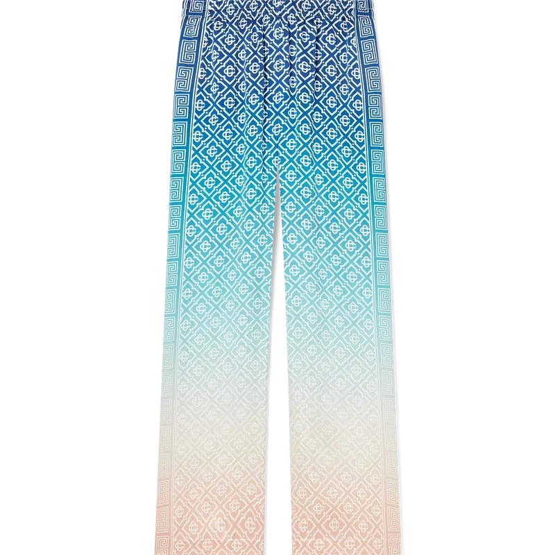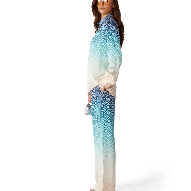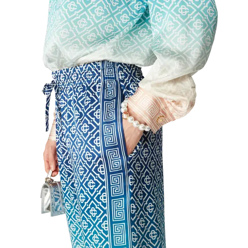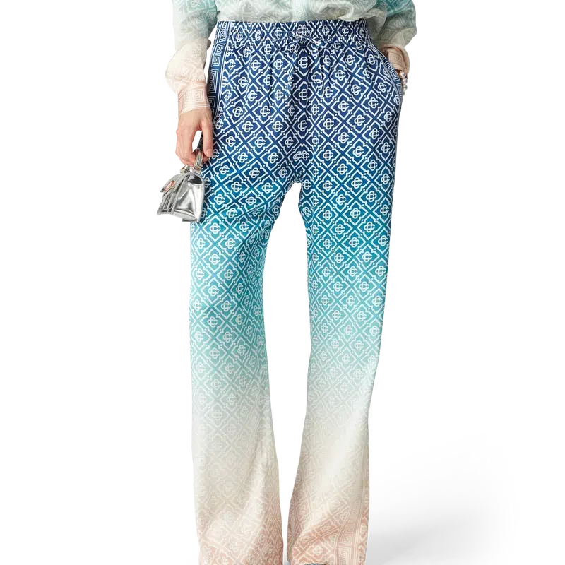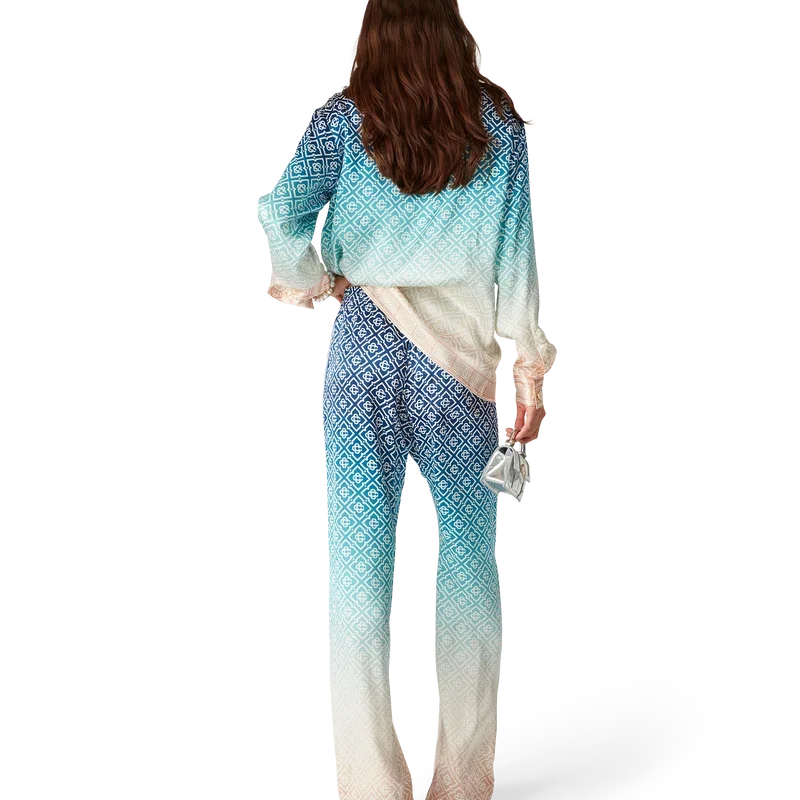 I pantaloni in seta jacquard sfumato presentano una stampa all-over con il monogramma iconico della Maison, realizzati in tessuto di raso di seta. Rifiniti con elastico in vita, tasche interne e fodera.
