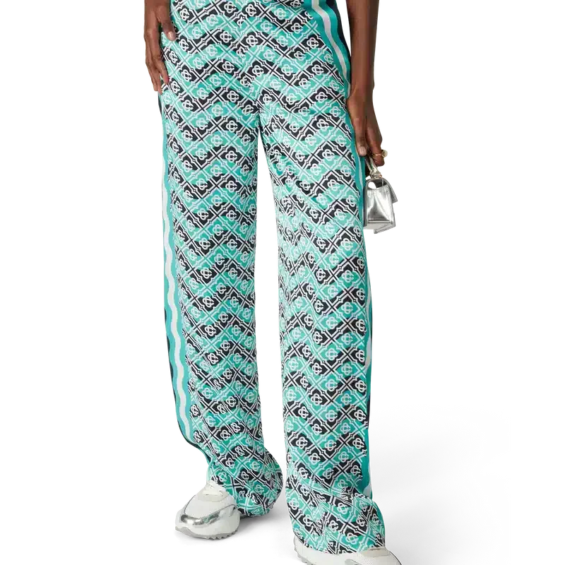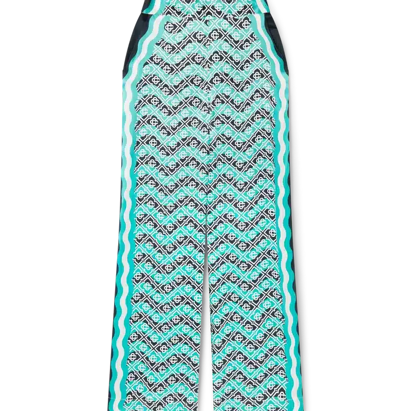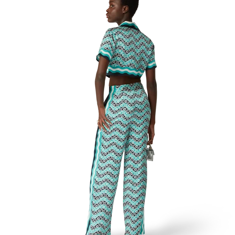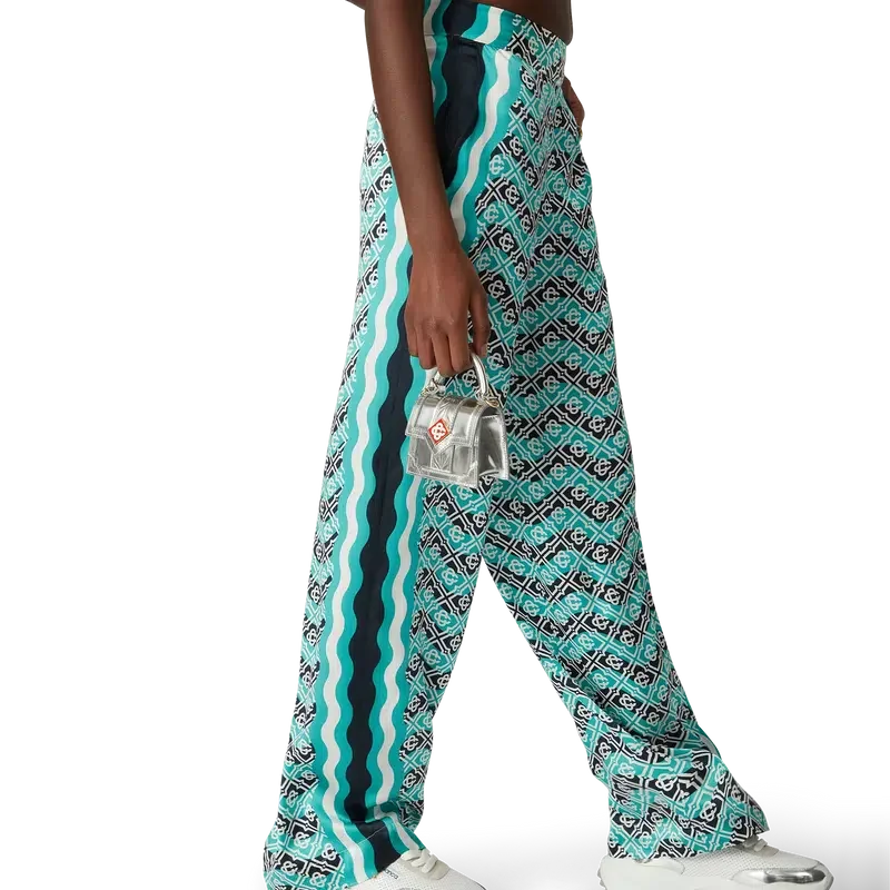 I pantaloni in raso di seta Monogram Wave presentano una stampa all-over con il caratteristico motivo Monogram della Maison, realizzati in raso di seta. Sono impreziositi da dettagli a strisce orizzontali ispirate al motivo Memphis Wave, strisce verticali lungo i fianchi e tasche laterali oblique.