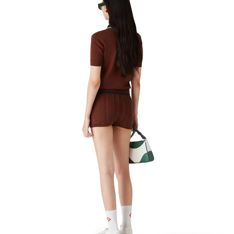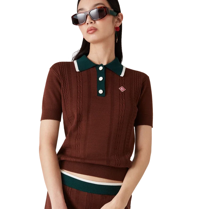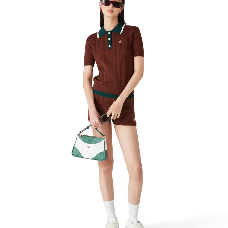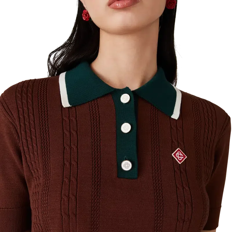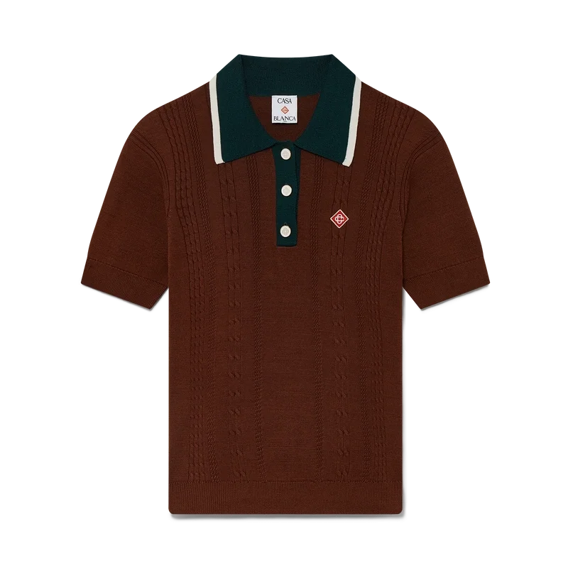 La polo a maglia intrecciata è un modello a maniche corte realizzato in tessuto di cotone lavorato a maglia con il caratteristico logo a rombi della Maison. Rifinita con bottoni piatti con logo CC, abbottonatura a tre bottoni, abbottonatura e colletto a costine a contrasto, con bordi bianchi sul colletto. Progettata per essere indossata con i pantaloncini a maglia intrecciata coordinati.