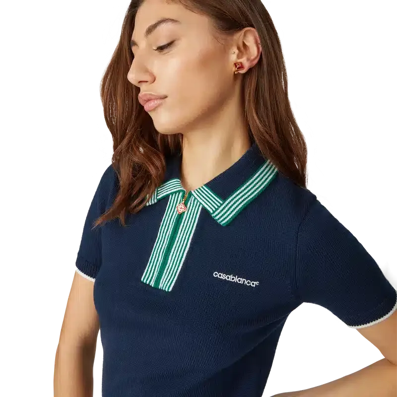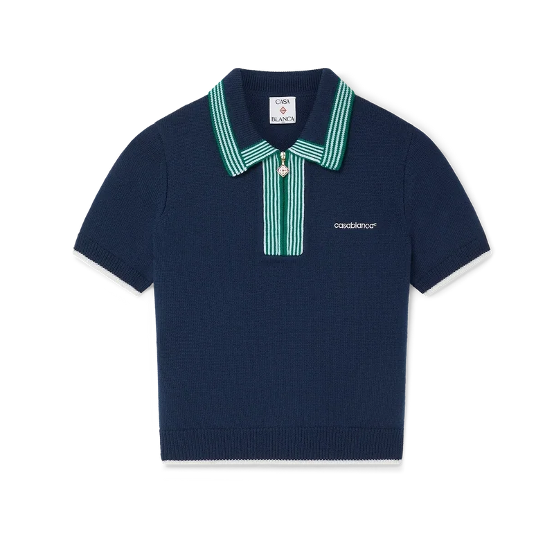 La polo da tennis in maglia è un modello classico realizzato in tessuto di lana merino. Rifinita con bordi a costine a contrasto su polsini, orlo, colletto e abbottonatura, chiusura frontale con zip, colletto a costine e logo Casablanca.