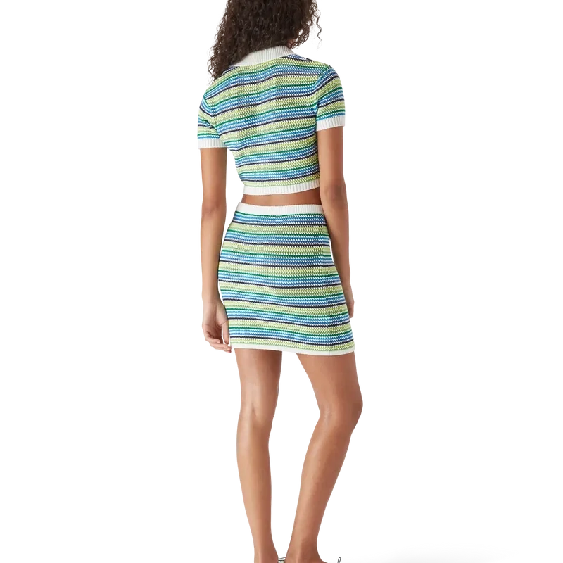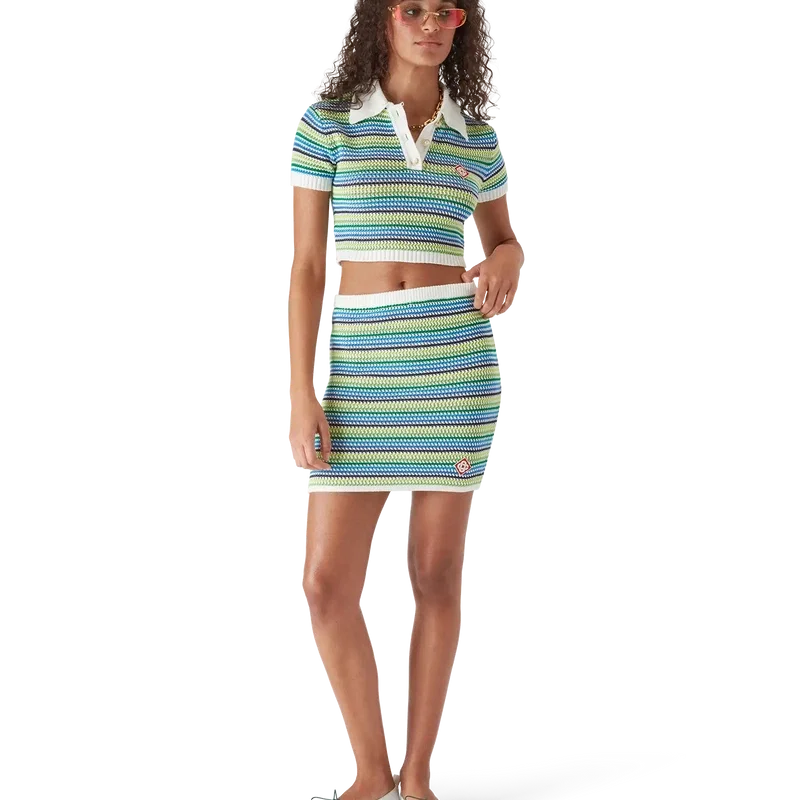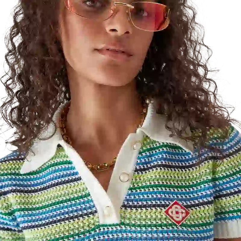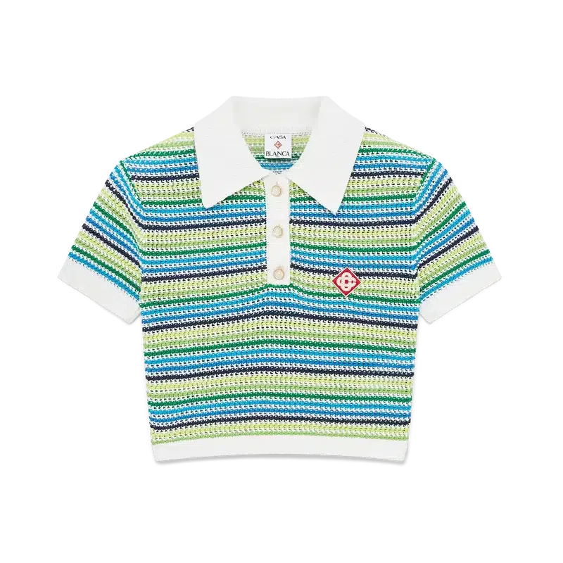La polo a righe è un modello corto a maniche corte con il caratteristico logo a diamante della Maison. Rifinita con tessuto a righe, abbottonatura, bottoni in madreperla con bordo dorato e dettagli a costine su colletto, polsini e orlo.
