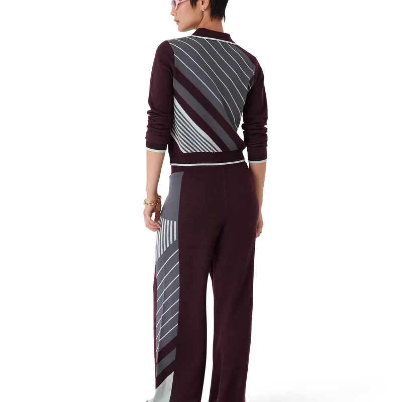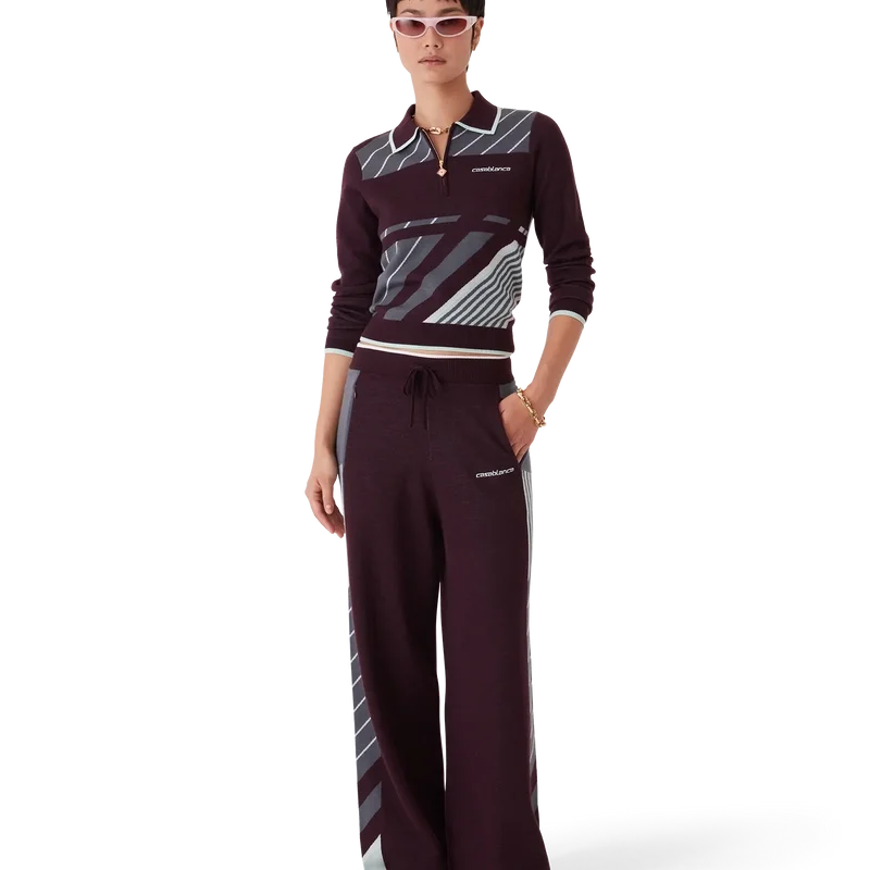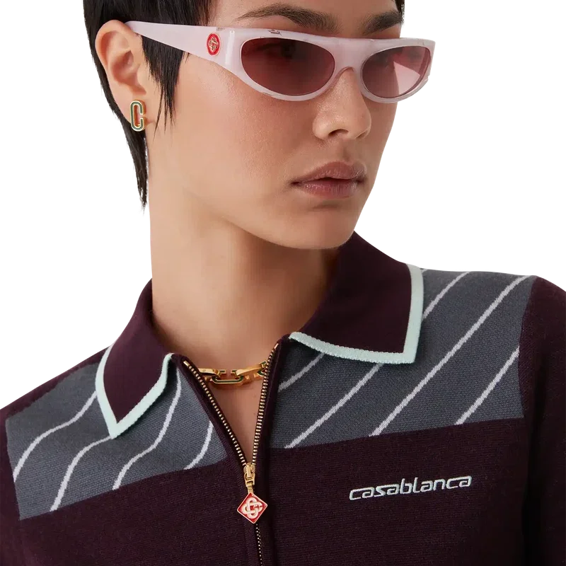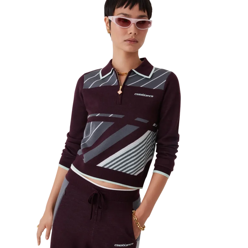 La polo a maniche lunghe in lana merino Diagonal Tennis presenta un design a maglia con strisce sportive diagonali e un logo Casablanca ricamato. È dotata di chiusura con zip a un quarto con linguetta con il caratteristico logo a diamante, collo a costine e bordi a contrasto su collo e polsini.