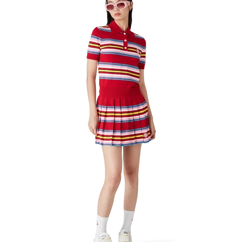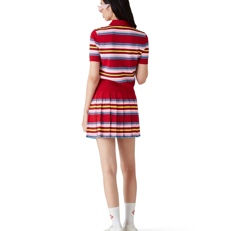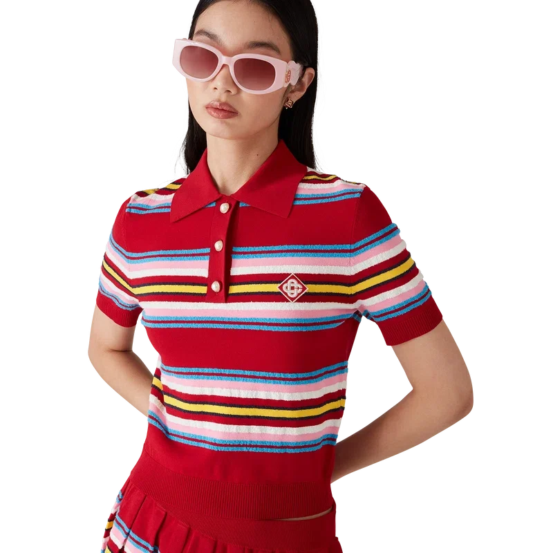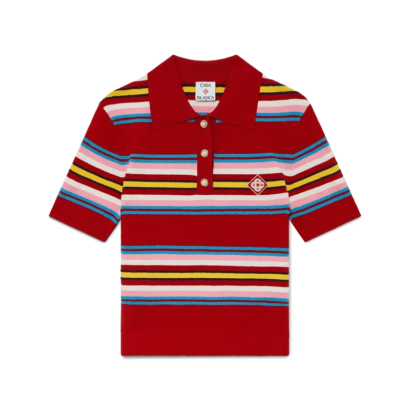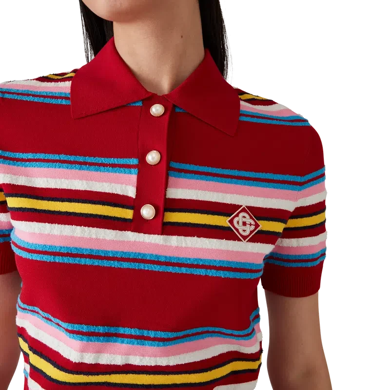 La polo a righe è un modello a maniche corte realizzato in tessuto a maglia a righe con il caratteristico logo a rombi della Maison. Rifinita con i caratteristici bottoni in madreperla con bordo dorato, abbottonatura a tre bottoni e polsini, orlo, colletto e abbottonatura a costine.