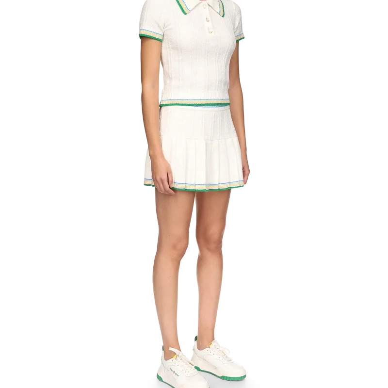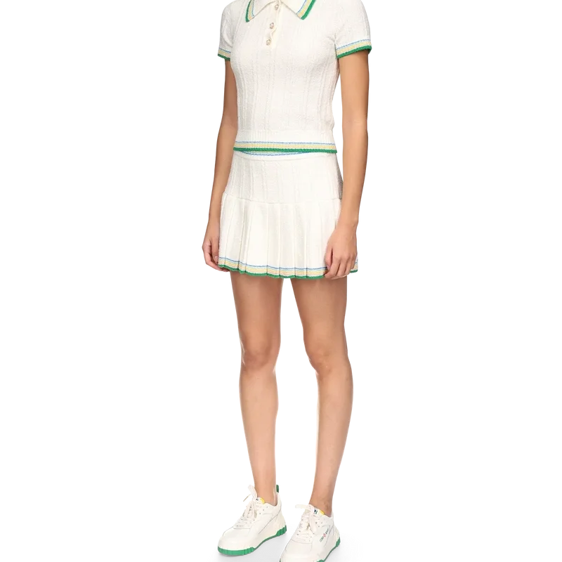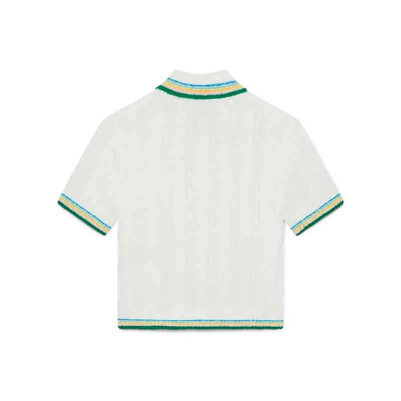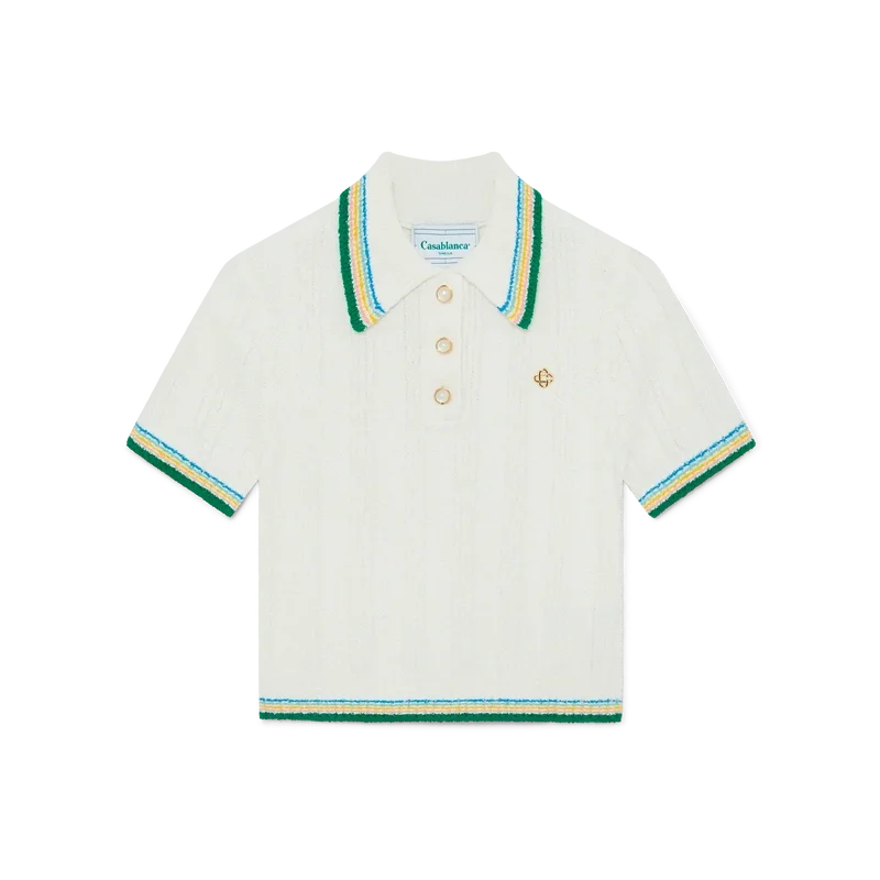 La polo in bouclé a coste presenta una morbida trama a coste e sfoggia il rivetto con il logo CC intrecciato placcato oro della Maison sul petto. Realizzata in tessuto a maglia a coste misto cotone e rifinita con i caratteristici bottoni in madreperla con bordo dorato e dettagli a righe su colletto, polsini e orlo. La palette di colori di questa collezione è leggera e idealistica, e sottolinea i temi eterei che sono al centro del nostro marchio.
