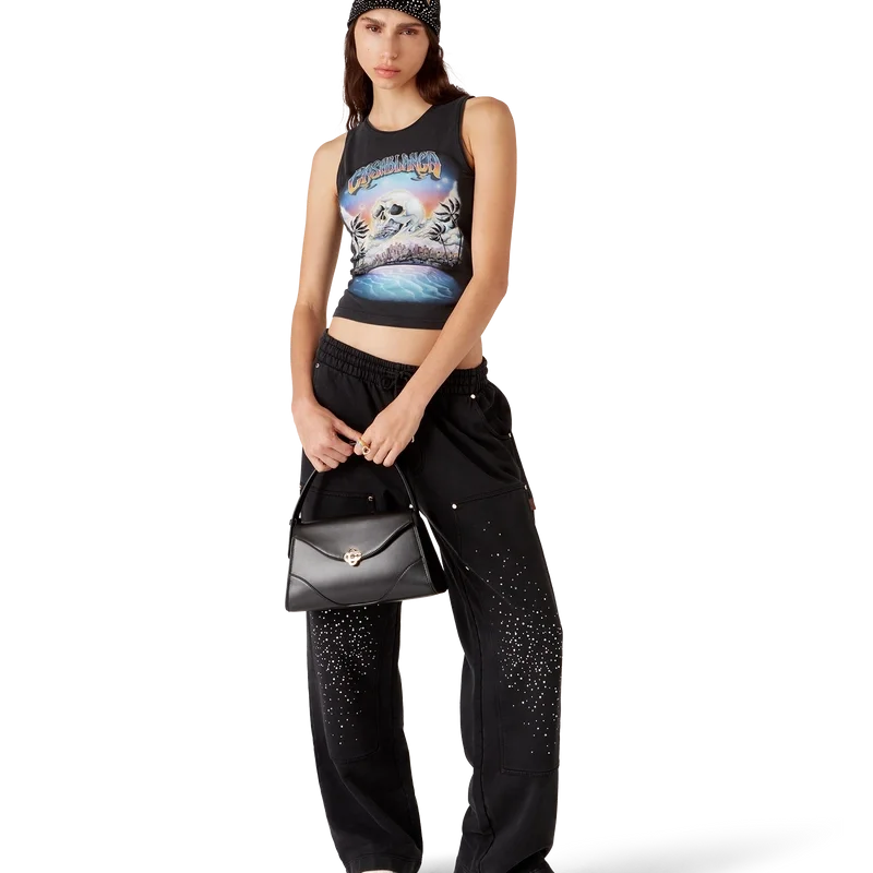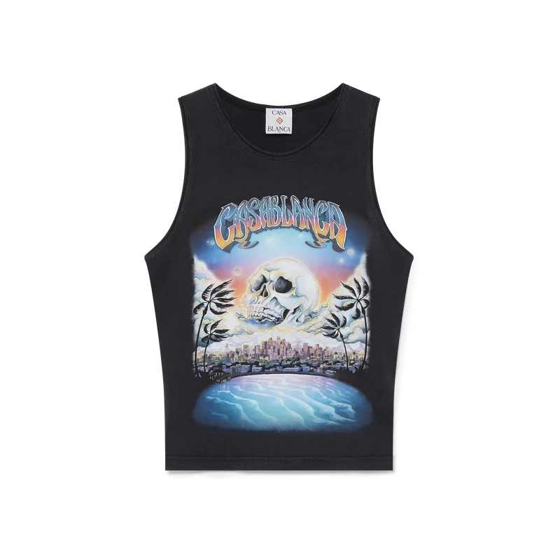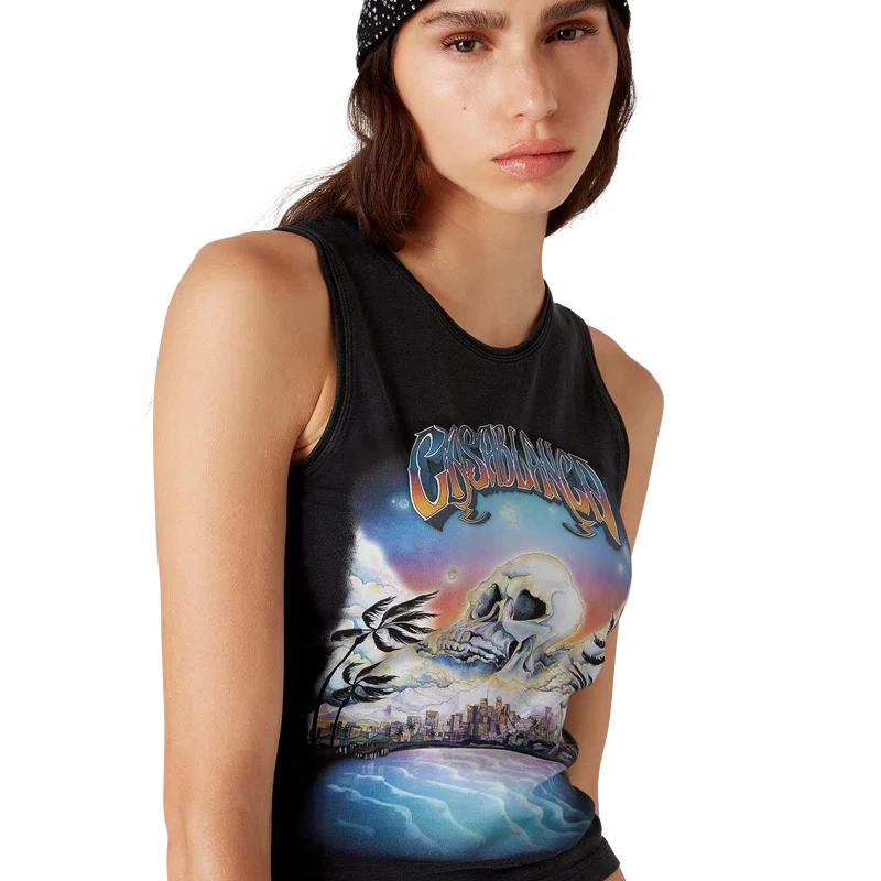 La canotta corta La Pramonition è un modello senza maniche realizzato in tessuto di cotone stampato con una grafica stagionale ispirata a una visione inquietante dello skyline di Los Angeles di notte, con elementi UFO che richiamano l’ispirazione fantascientifica vintage. Completata da un classico girocollo. Progettata per arrivare sopra l’ombelico.