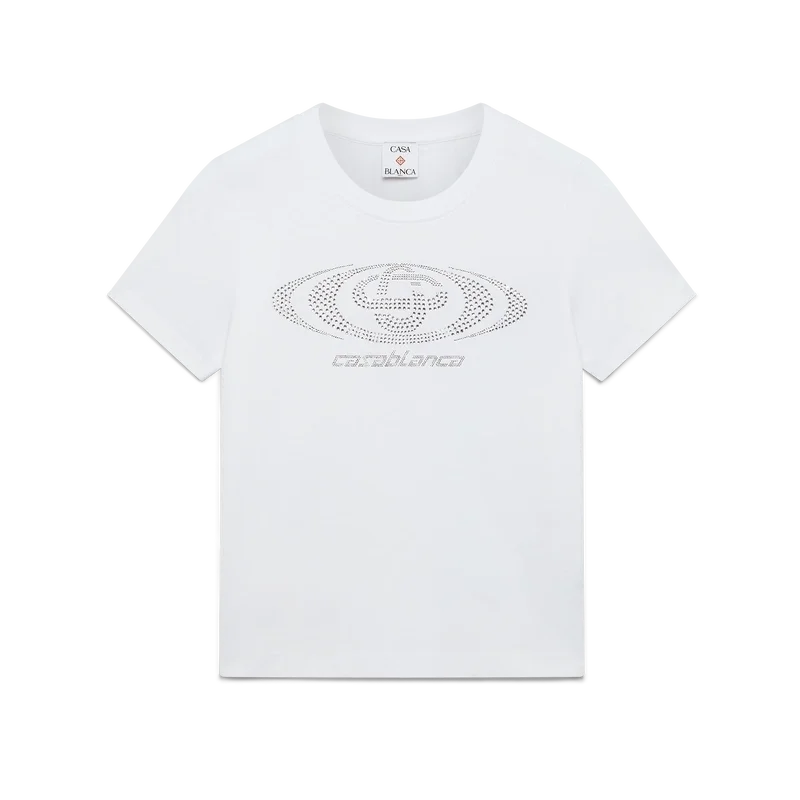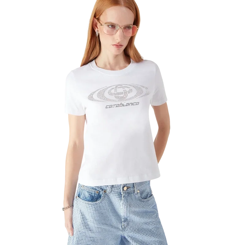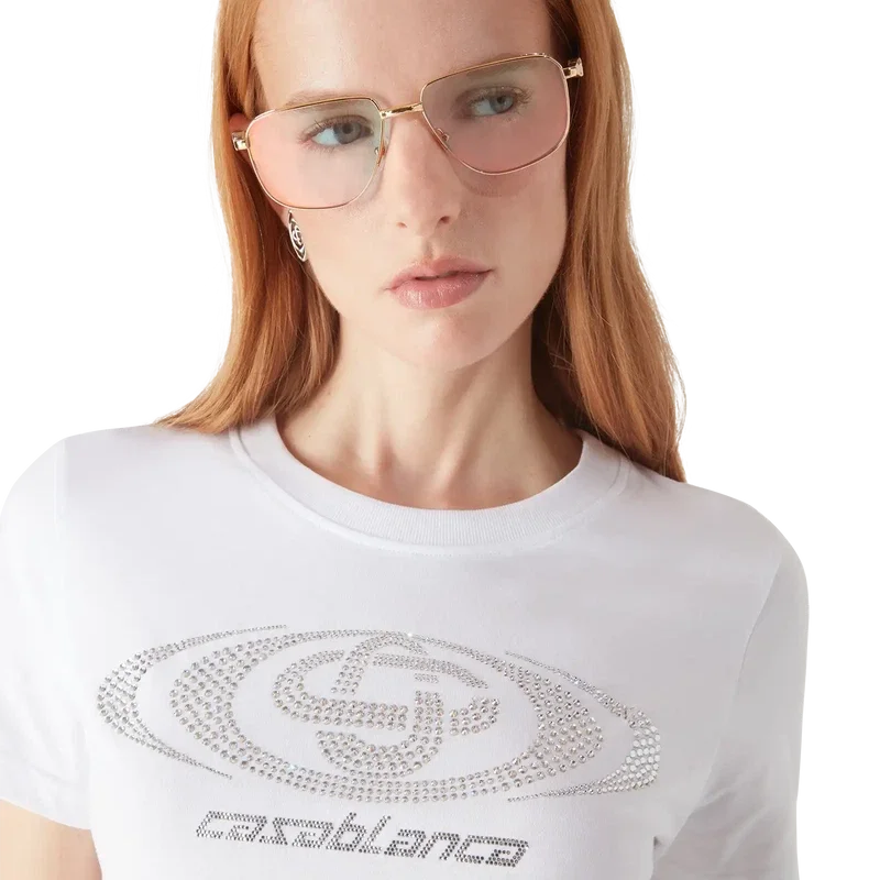 La T-shirt aderente con logo Crystal Warped è un modello a maniche corte caratterizzato dal logo Warped della Maison realizzato con cristalli di vetro. Completata da un classico girocollo.